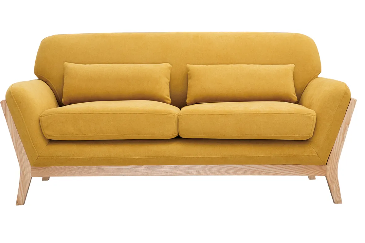 Le mariage entre une assise généreuse, habillée d’une trame 100% polyester – aussi agréable à l’oeil qu’au toucher – et une structure apparente en bois massif (frêne massif), fait tout le charme de ce canapé en tissu effet velours jaune moutarde et bois clair.