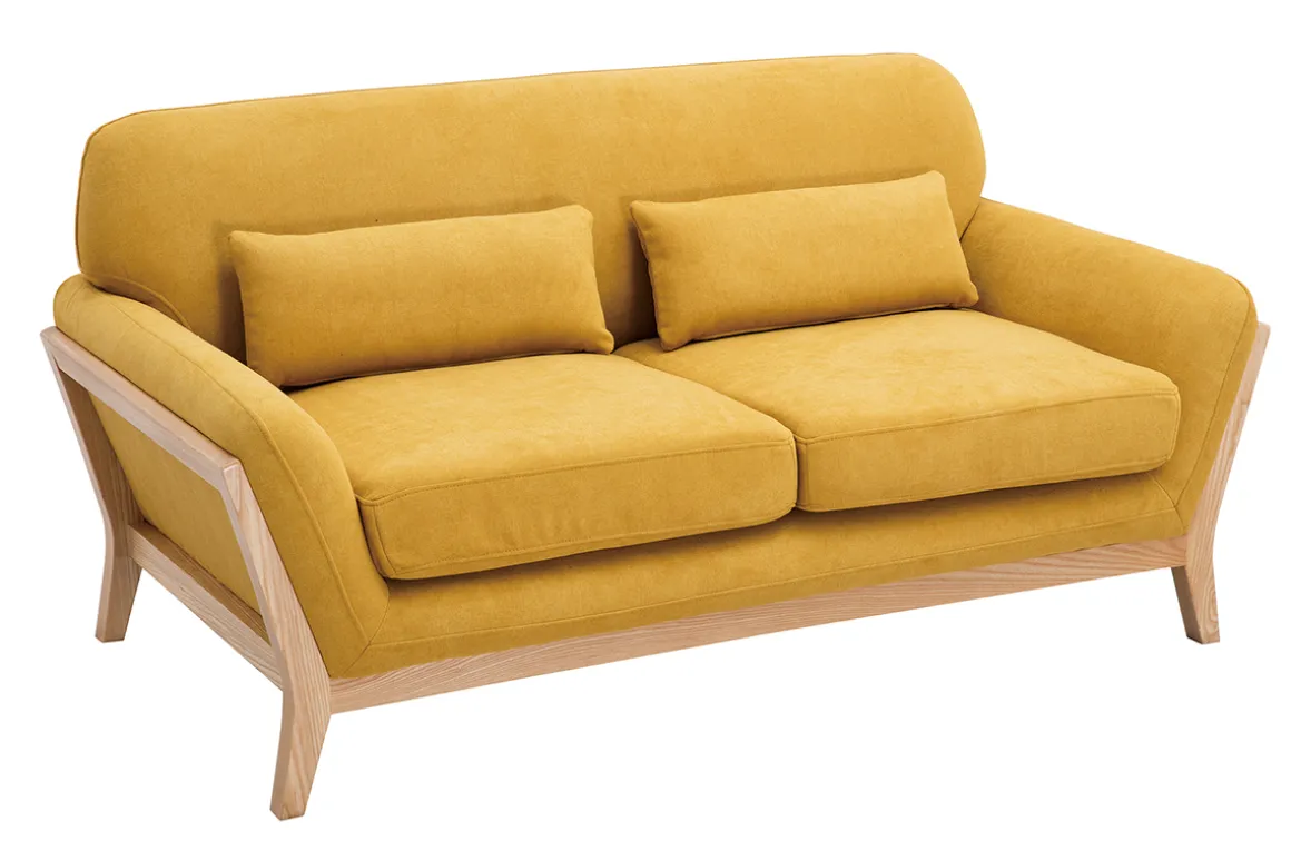 Avec ses coussins d’assise de 14 cm d’épaisseur et ses deux petits coussins d’appoint, ce canapé scandinave 2 places se veut résolument accueillant ! Ses accoudoirs légèrement inclinés sont parfaits pour les moments lecture… comme les pauses sieste ! Grâce à ses dimensions L160 x P83.5 x H78.5 cm, ce petit canapé jaune moutarde 2 personnes trouvera parfaitement ses marques dans un studio ou un séjour où chaque m² compte !