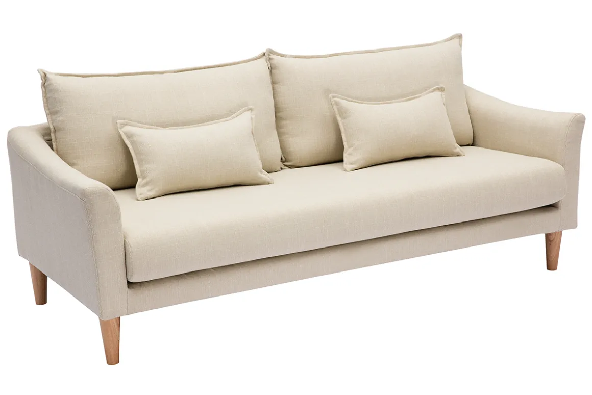 Ce canapé beige a tout pour devenir la pièce maîtresse du salon. Ses dimensions (L180.5 x P78 x H77 cm) permettent d’asseoir confortablement trois personnes et ses deux coussins d’appoint d’ajuster le confort en fonction de chacun. L’assise moelleuse du canapé KATE ravira les adeptes d’instants détente dans le salon.
