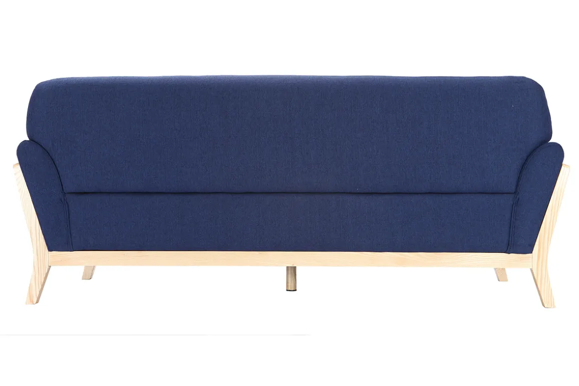 Canapé 3 places en tissu bleu et bois clair YOKO livré prêt à assembler. Montage simple, seul le dossier est à fixer. Le colis étant volumineux, nous vous conseillons de vérifier que portes et escaliers permettent son passage.