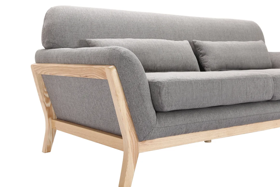 Canapé 3 places en tissu gris et bois clair YOKO livré prêt à assembler. Montage simple, seul le dossier est à fixer. Le colis étant volumineux, nous vous conseillons de vérifier que portes et escaliers permettent son passage.
