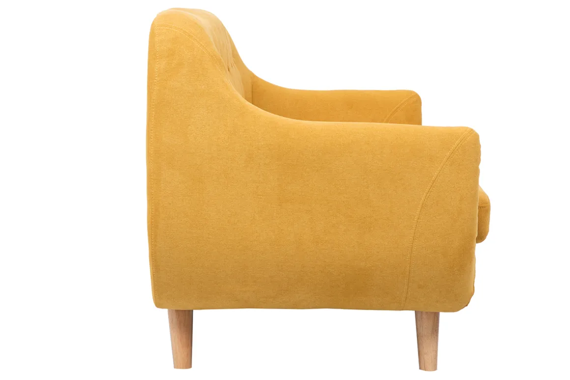 Sa forme tout en courbes, son dossier capitonné et son piètement en hévéa massif font tout le charme de ce petit canapé confortable. Si l’ensemble rappelle le style scandinave et les années 50, le joli revêtement effet velours moutarde apporte une touche colorée très actuelle. Son petit plus ? Ses dimensions ! Le modèle YNOK est une version gain de place des beaux canapés scandinaves. Il est idéal pour aménager un coin salon dans un studio.