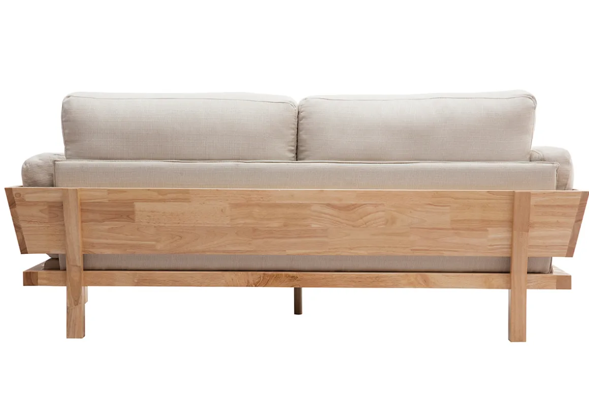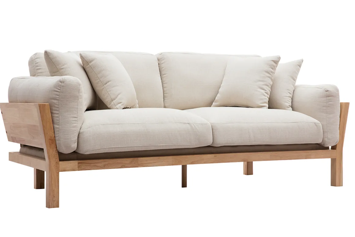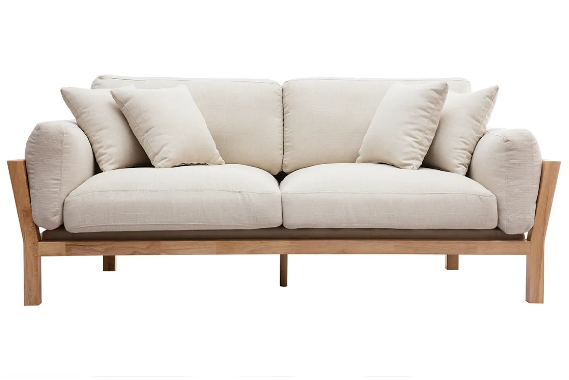 À la fois fonctionnel et esthétique, le canapé KYO possède tous les fondamentaux du style nordique : couleurs, matières, design épure et fonctionnalité. Ce canapé en bois et tissu en impose par sa structure originale en hévéa massif. Un soubassement robuste qui contraste avec le revêtement blanc crème (100% polyester). De quoi apporter du caractère à votre intérieur ! Ce canapé 3 places blanc crème se mariera parfaitement avec un séjour aux notes colorées ou plus neutres, scandinave, bohème ou contemporain, mais toujours dans une atmosphère chaleureuse et cosy.