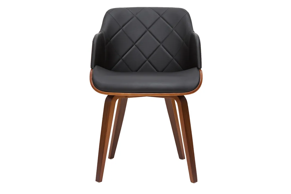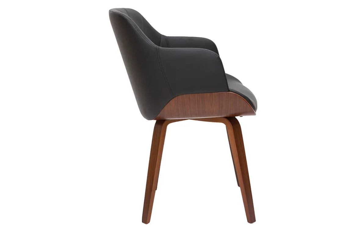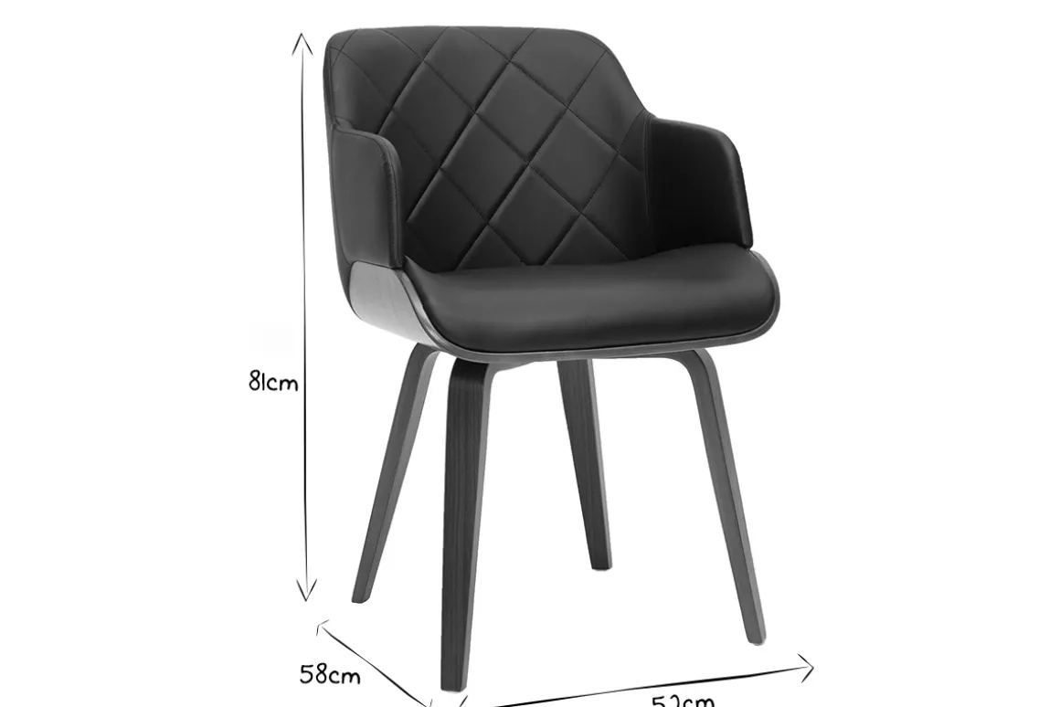 Parfait mélange entre polyuréthane noir et bois foncé, cette chaise dans l’air du temps ne manquera pas de sublimer votre salle à manger. Joli dossier matelassé et silhouette moderne façonnent cette chaise en pièce de mobilier hyper branchée ! Cette chaise avec accoudoirs au faux airs de fauteuil sera l’élément clé pour apporter une belle touche d’élégance et de chaleur dans la pièce.