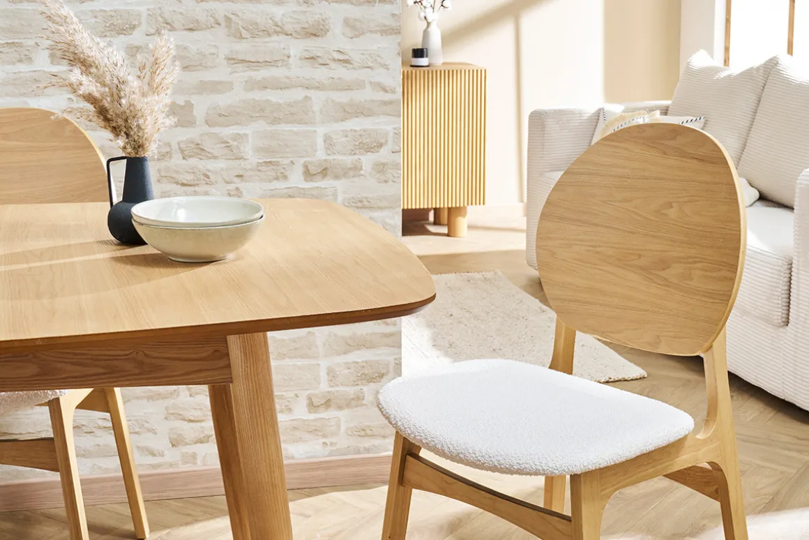 Pour créer un ensemble graphique, ces chaises blanches et bois clair seront du plus bel effet autour d’une table à manger ronde.