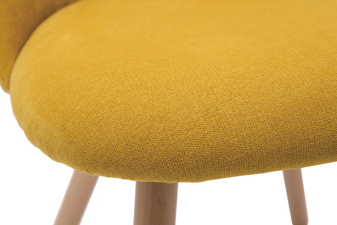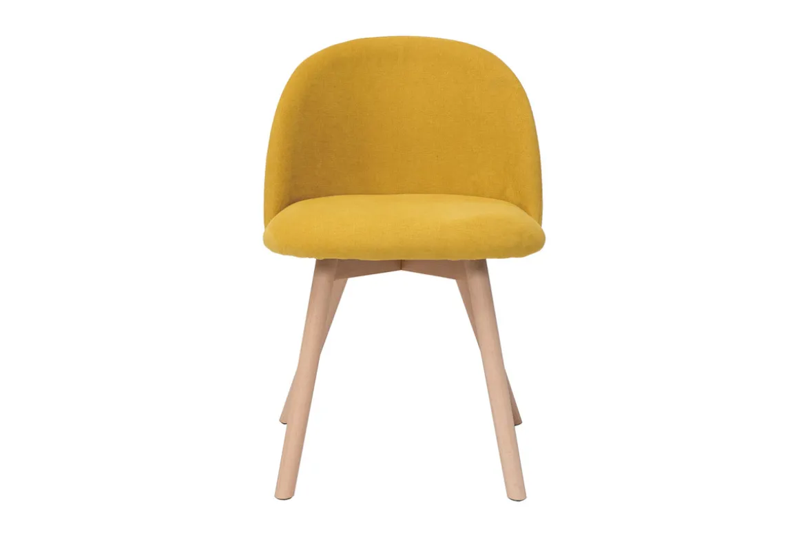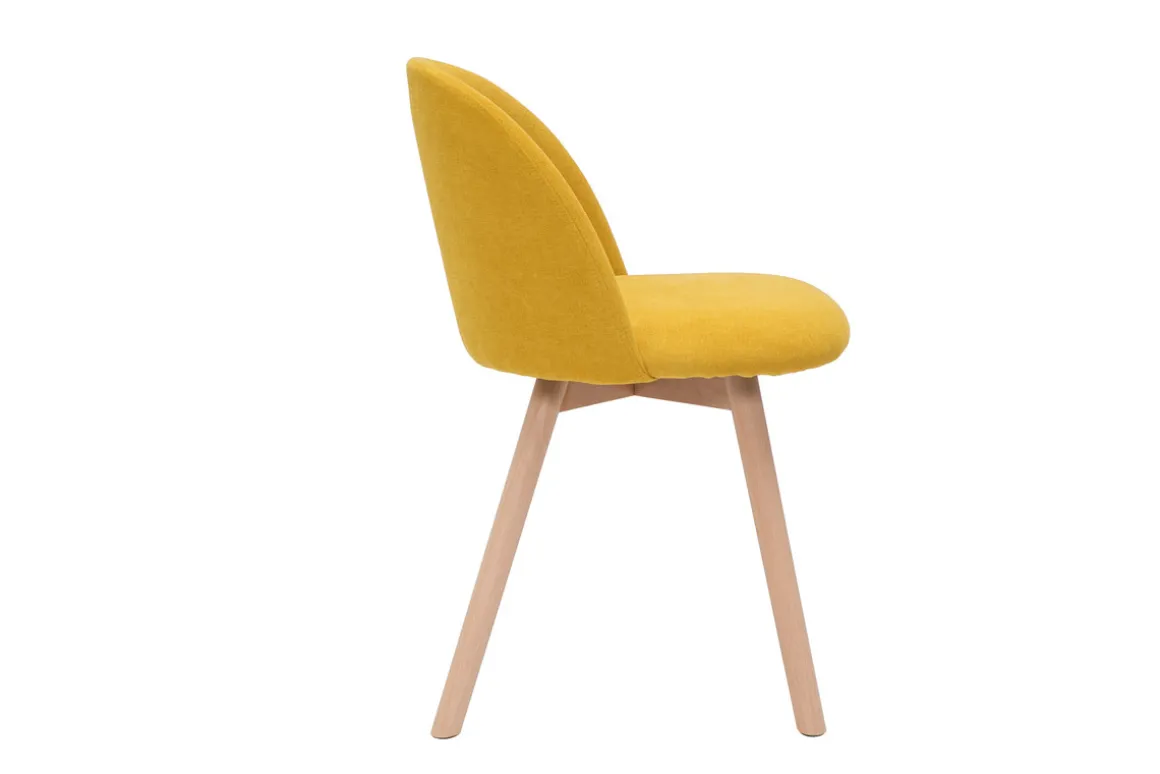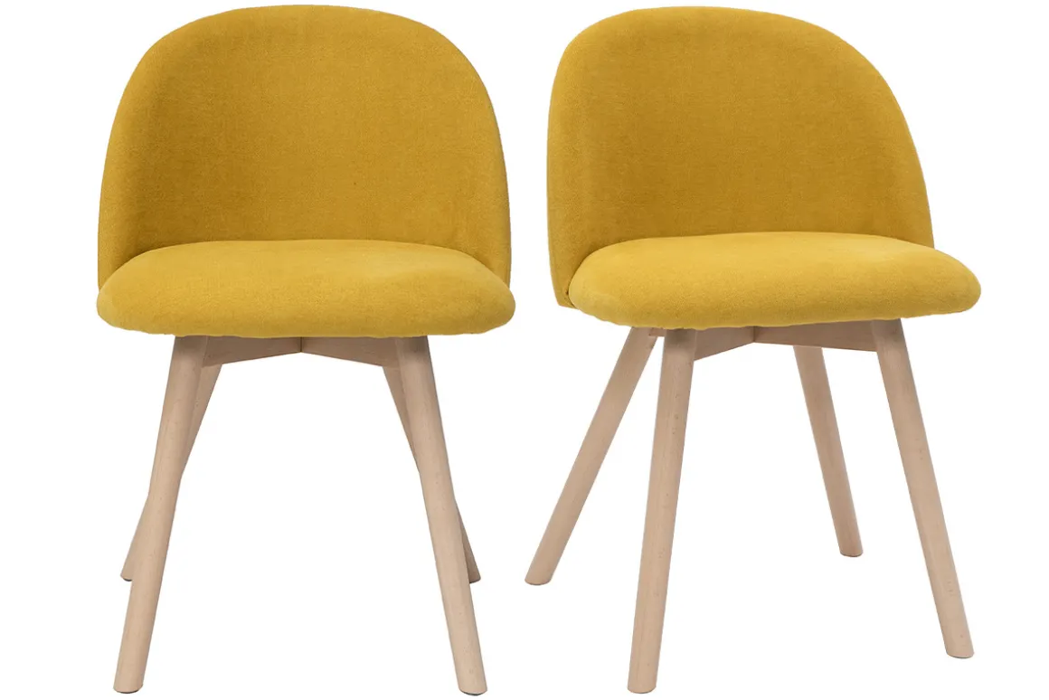 Tissu effet velours jaune mourtarde, pieds en hêtre massif, lignes arrondies : les chaises CELESTE reflètent tout ce qui fait le charme du style scandinave.