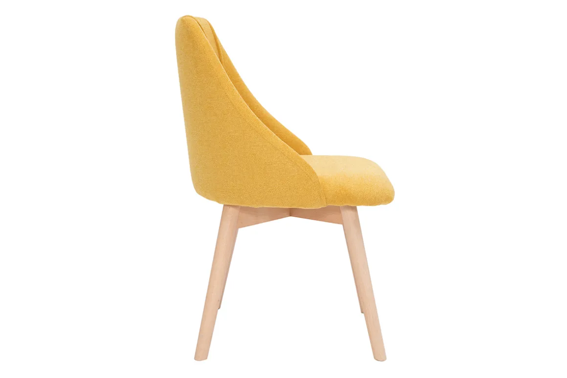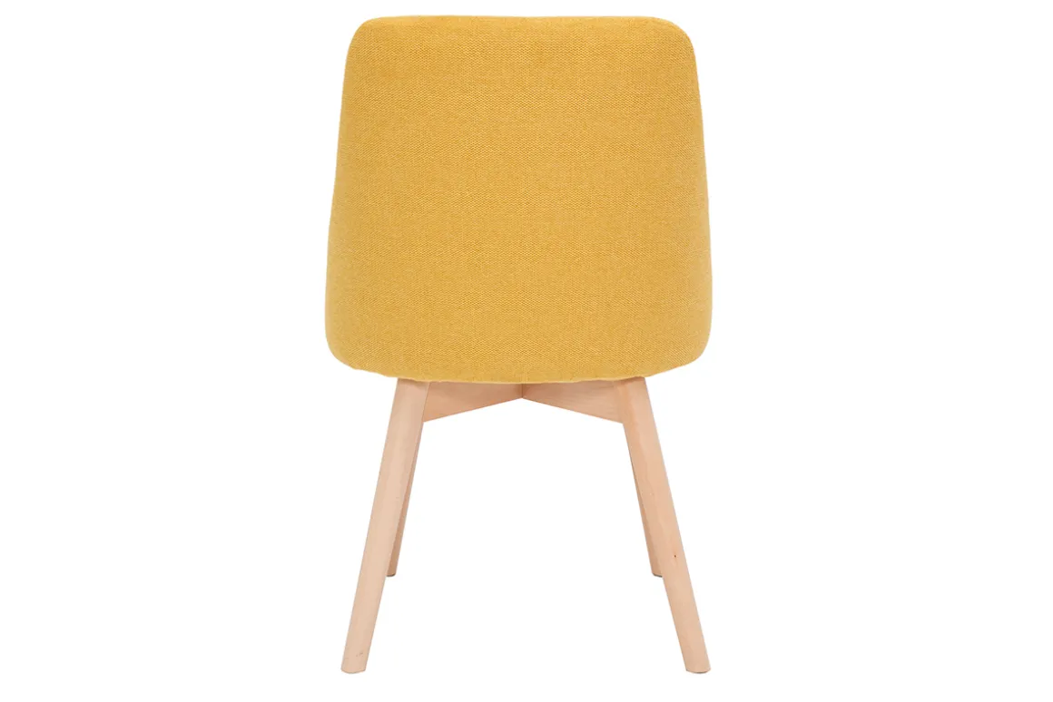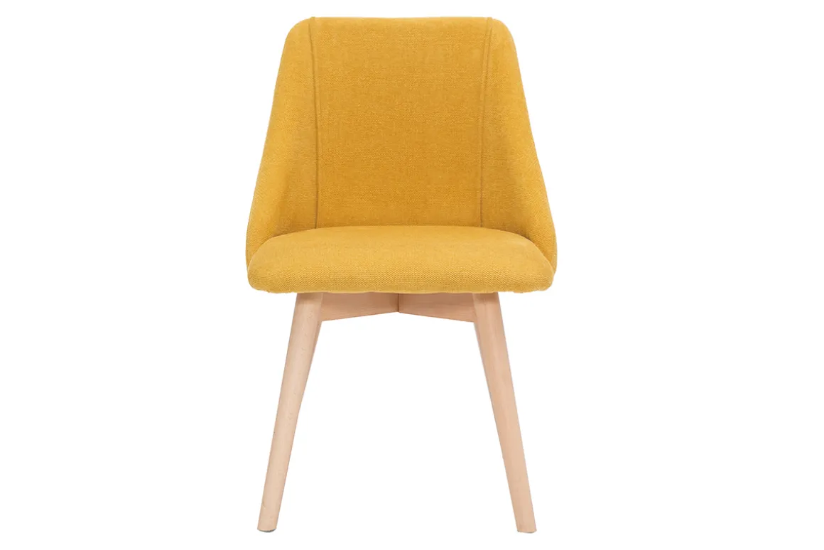 Chaises scandinaves en tissu effet velours texturé jaune moutarde et bois clair HIGGINS vendues par lot de 2. Livrées prêtes à assembler. Montage simple, seuls les pieds sont à fixer.