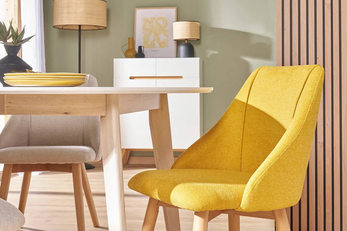 La trame du tissu effet velours texturé jaune moutarde s’accorde parfaitement avec le piètement en hêtre massif.