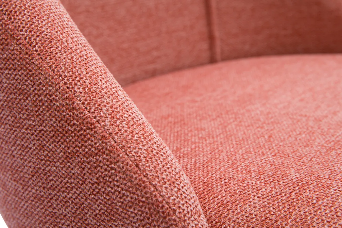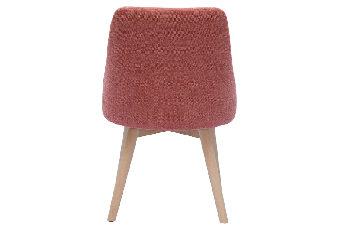 La trame du tissu effet velours texturé terracotta s’accorde parfaitement avec le piètement en hêtre massif.
