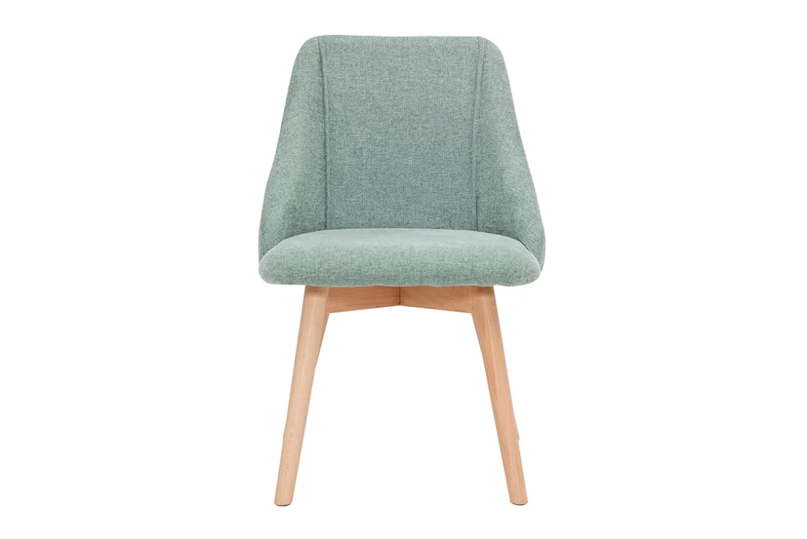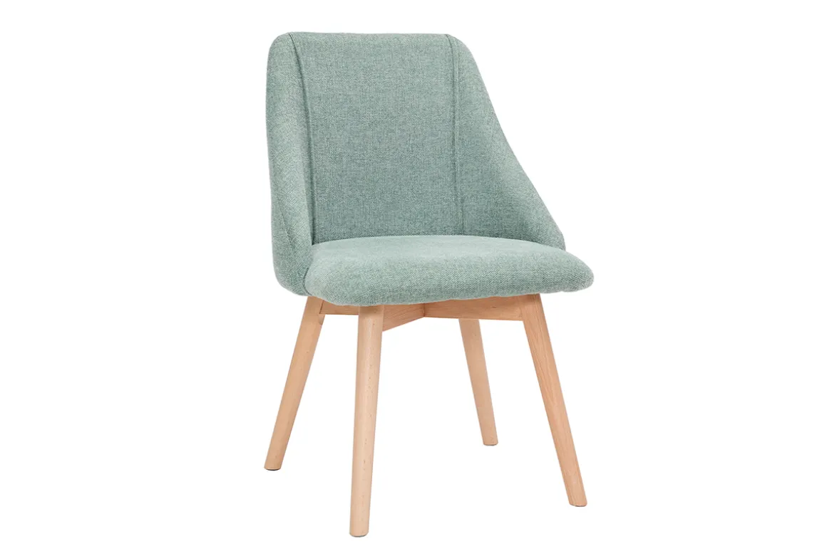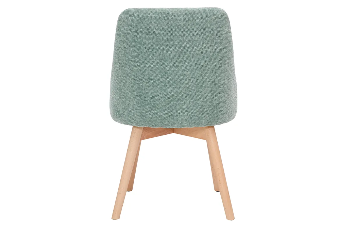 La trame du tissu effet velours texturé céladon s’accorde parfaitement avec le piètement en hêtre massif.
