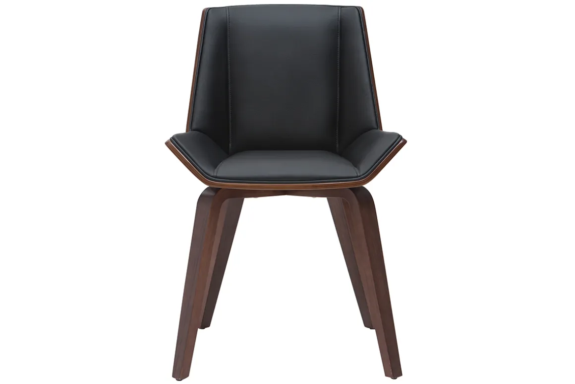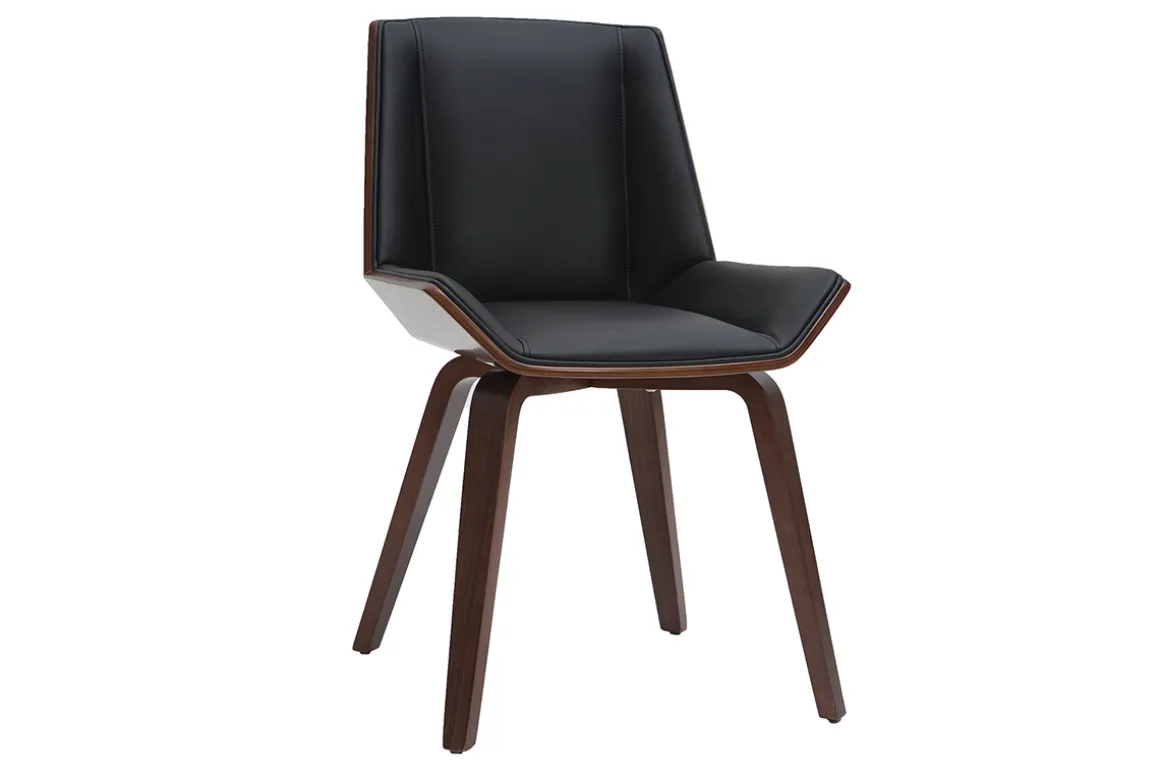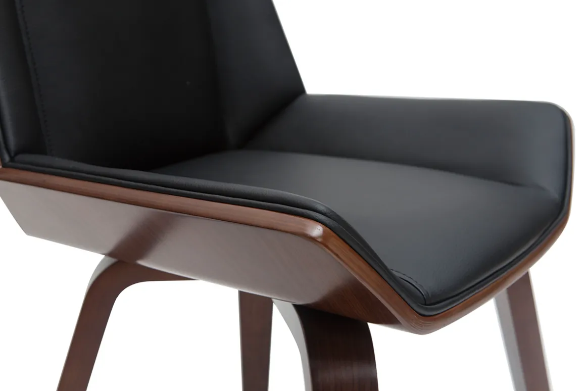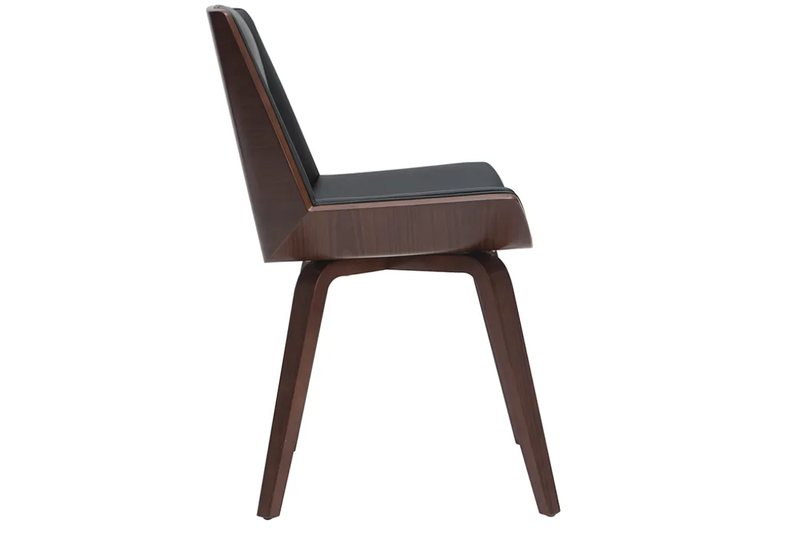 Cette chaise de salle à manger joue la carte des contrastes et des mélanges avec brio. On aime l’association du polyuréthane noir et du placage noyer, à la fois moderne et élégante. Le mariage entre un piètement aux lignes arrondies et une assise au découpage géométrique font de cette chaise design un élément clé autour d’une table à manger. Parfait pour créer un espace repas à la fois tendance et chaleureux !