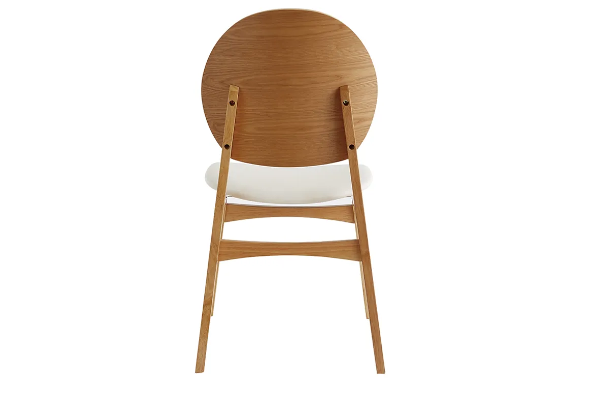 Pour créer un ensemble graphique, ces chaises blanches et bois clair seront du plus bel effet autour d’une table à manger ronde.