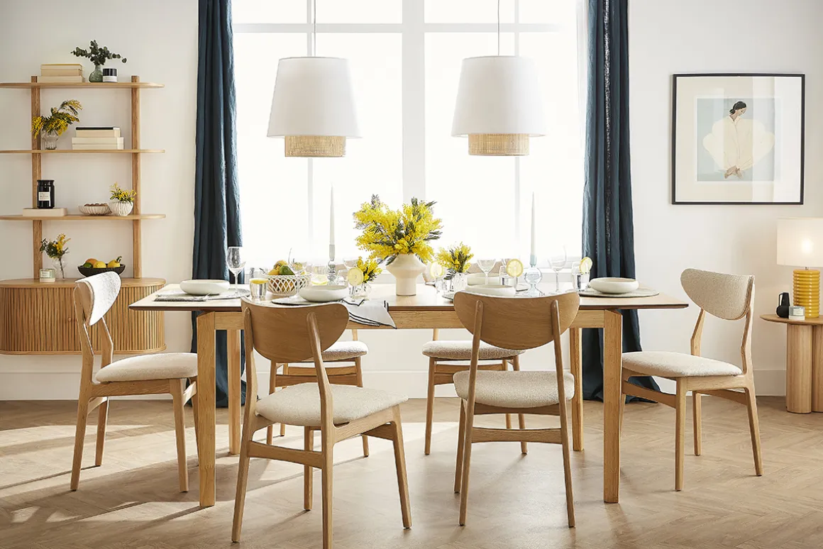 Pour un espace repas aux accents rétro, une table à manger couleur noyer contrastera joliment avec les couleurs claires de ces chaises épurées. On les imagine également très bien autour d’une table à manger bois clair pour insuffler un esprit nordique, ou encore d’une table minimaliste afin de créer un espace repas soigné !