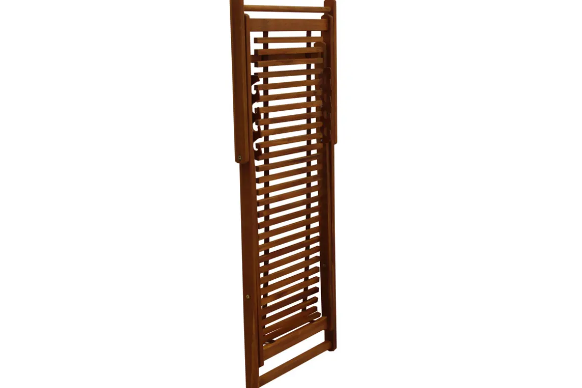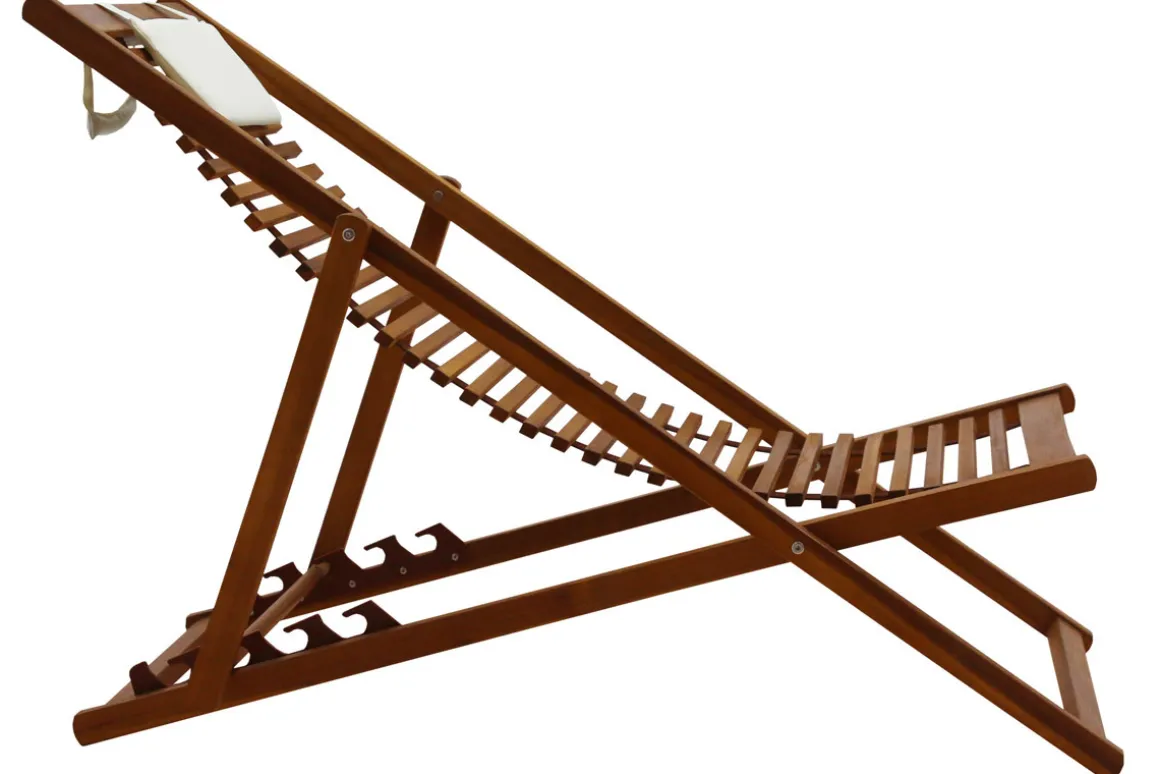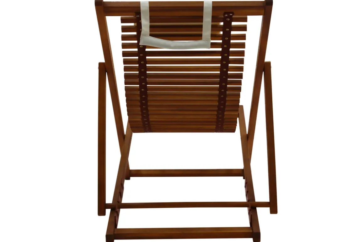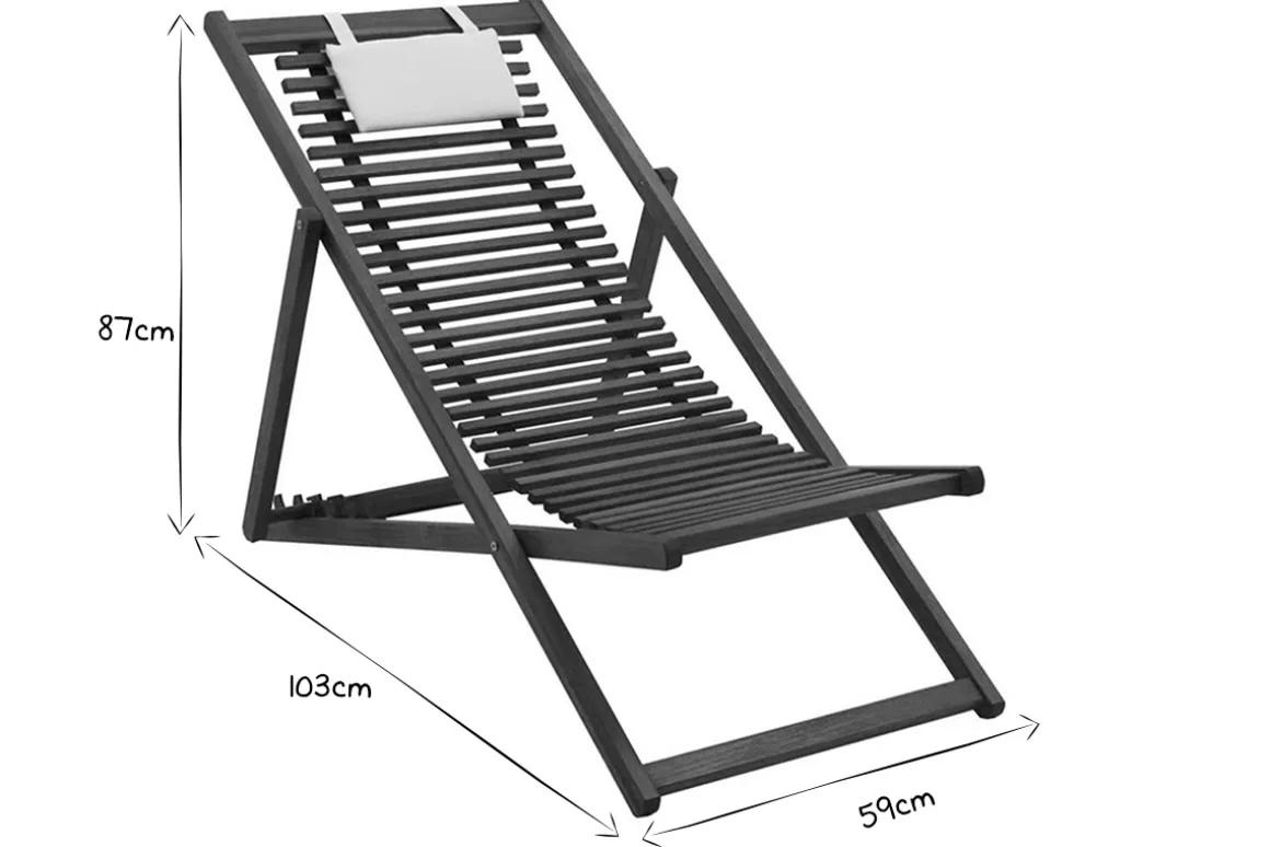 Composée d’une structure en acacia massif, la toile traditionnelle est remplacée par un jeu souple de lattes en bois. Cette assise d’un nouveau genre épouse parfaitement le corps et garantit un confort absolu ! Ces chiliennes en bois disposent également d’un coussin moelleux blanc : une têtière accueillante pour un confort supplémentaire ! Voilà qui contraste à merveille avec les nuances foncées qu’offre le bois.