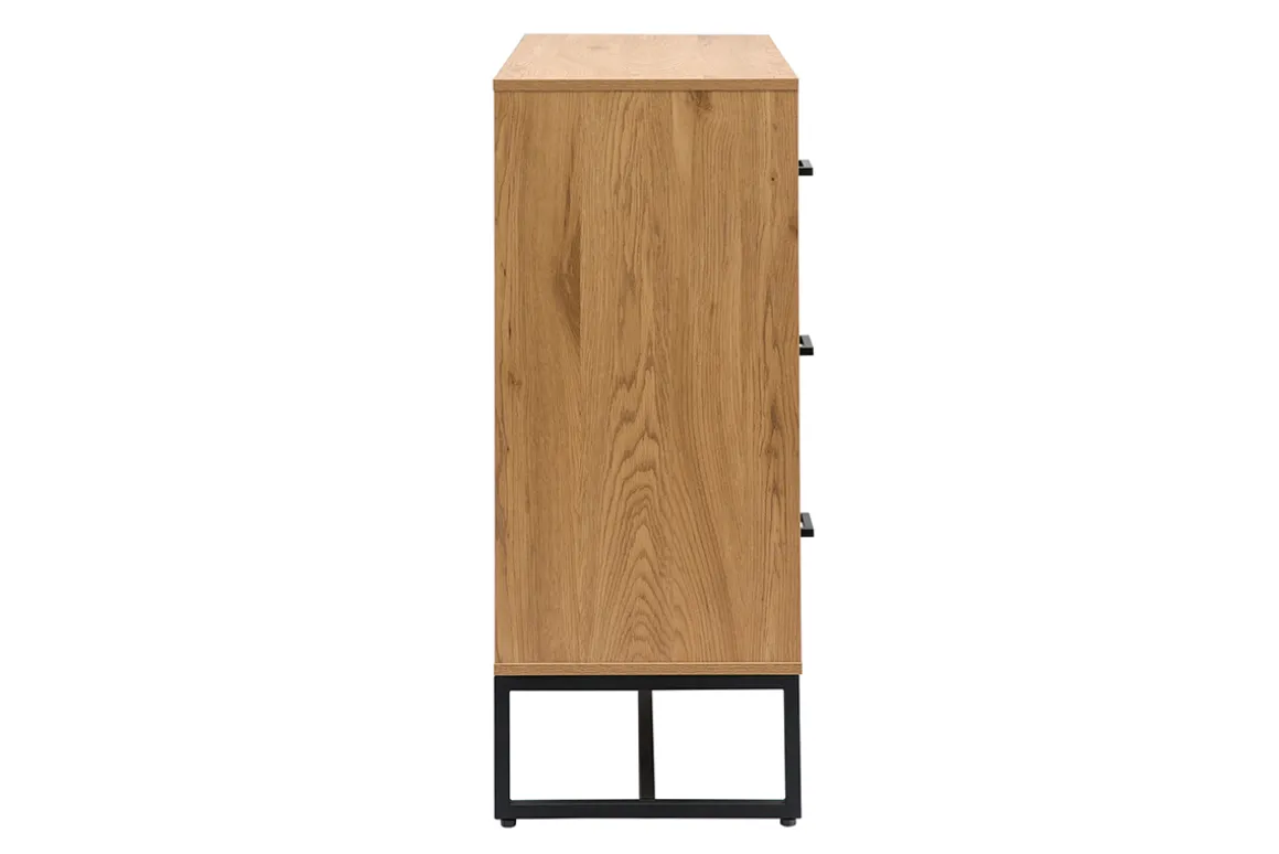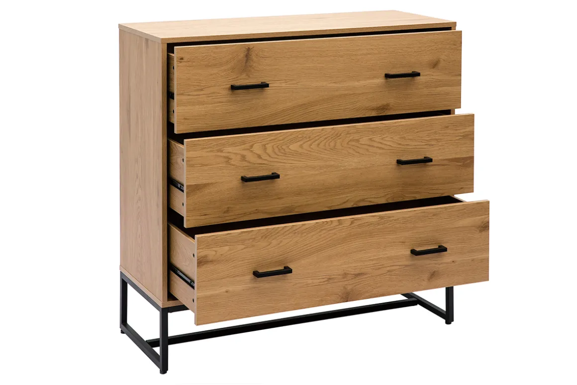 Peu profonde, cette commode à tiroirs offre toutefois une belle capacité de rangement avec ses 3 grands tiroirs (dimensions intérieures des tiroirs : L92 x P33.5 x H18 cm). Ces derniers s’ouvrent à l’aide de fines poignées en métal noir ce qui renforce au passage l’esthétique industrielle du produit.