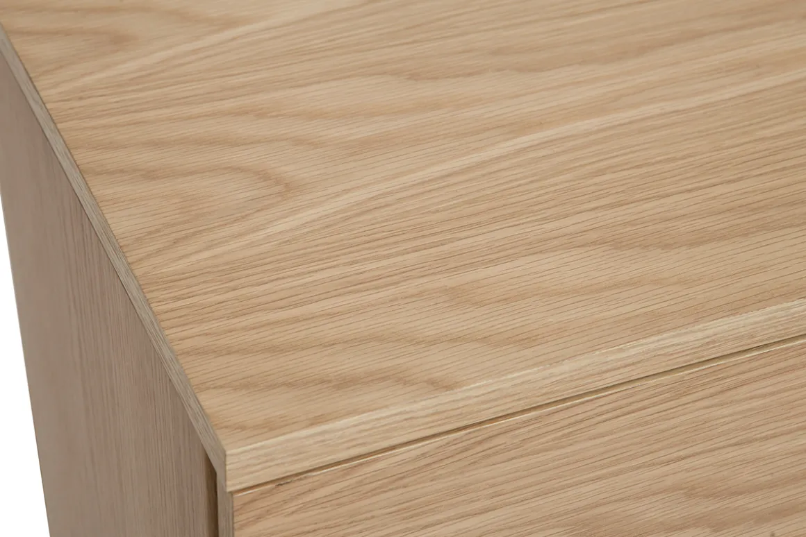 Au premier coup d’oeil, cette commode en bois clair donne le ton d’une pièce de mobilier scandinave ultra chaleureuse. Une structure en panneaux de fibres de bois placage chêne, des pieds en chêne massif : voici un meuble de rangement qui mise sur un total look bois pour réchauffer votre décoration d’intérieur avec style !