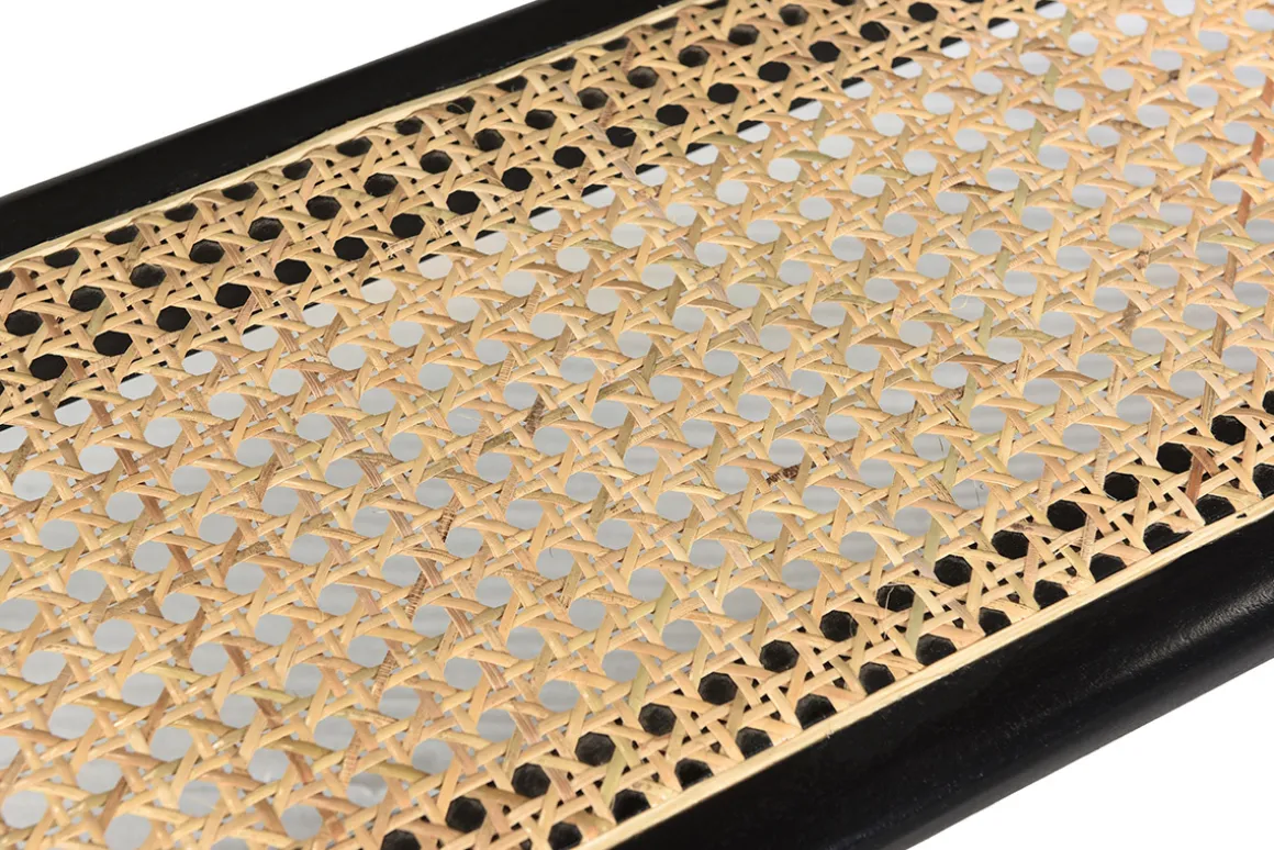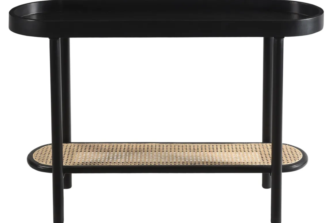 Sobre et élégante, la structure en acacia massif teinté noir est sublimée par des finitions toutes en rondeur. Empreint de poésie, le cannage de rotin blond, pare la tablette sous-jacente (L104 x L24 x H18 cm) de ses doux entrelacs. L’ensemble contraste pour un résultat ultra tendance qui apportera du caractère à votre intérieur ! Loin des standards, unique et riche de sa propre histoire, ce meuble est fabriqué à la main. Au charme authentique, cette console noire et cannage séduira inévitablement les aficionados des styles rétro, bohème ou ethnique chic.