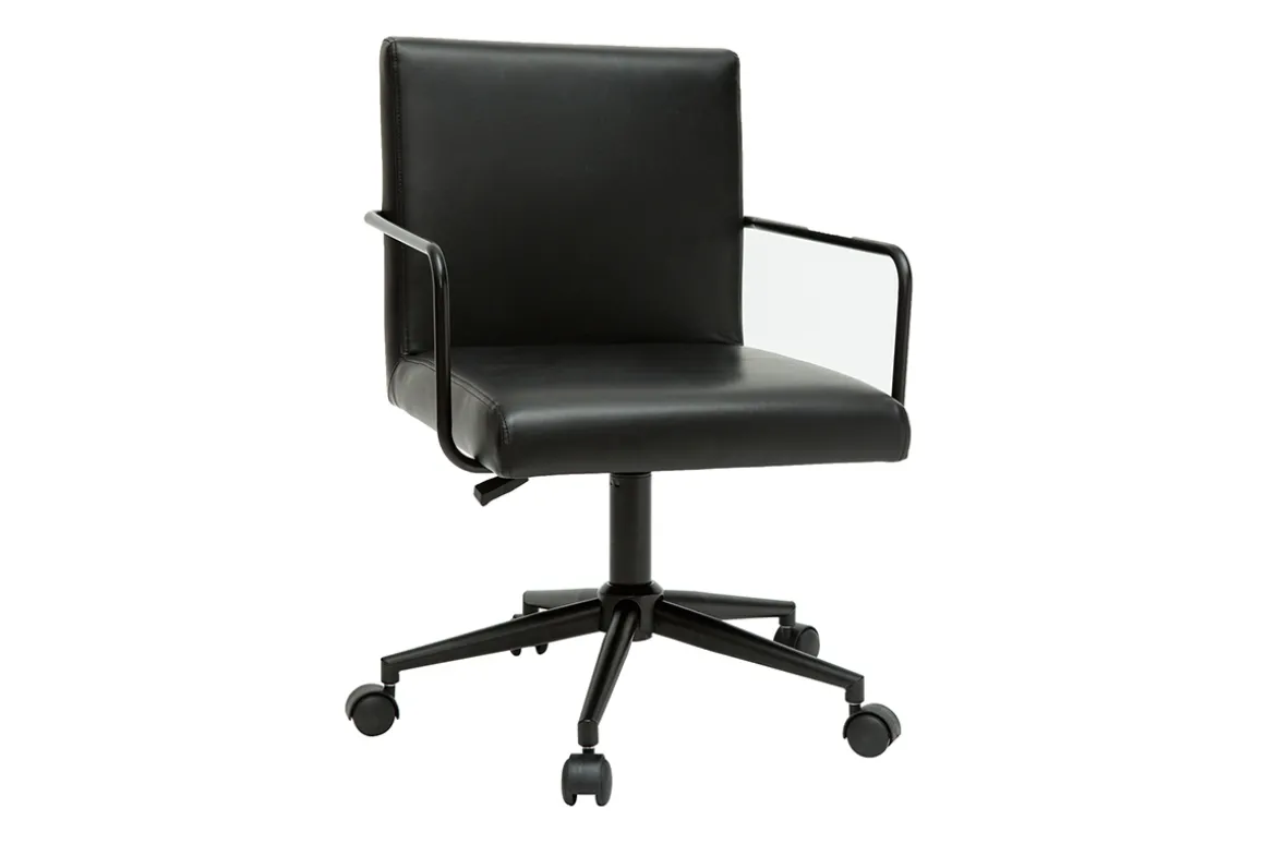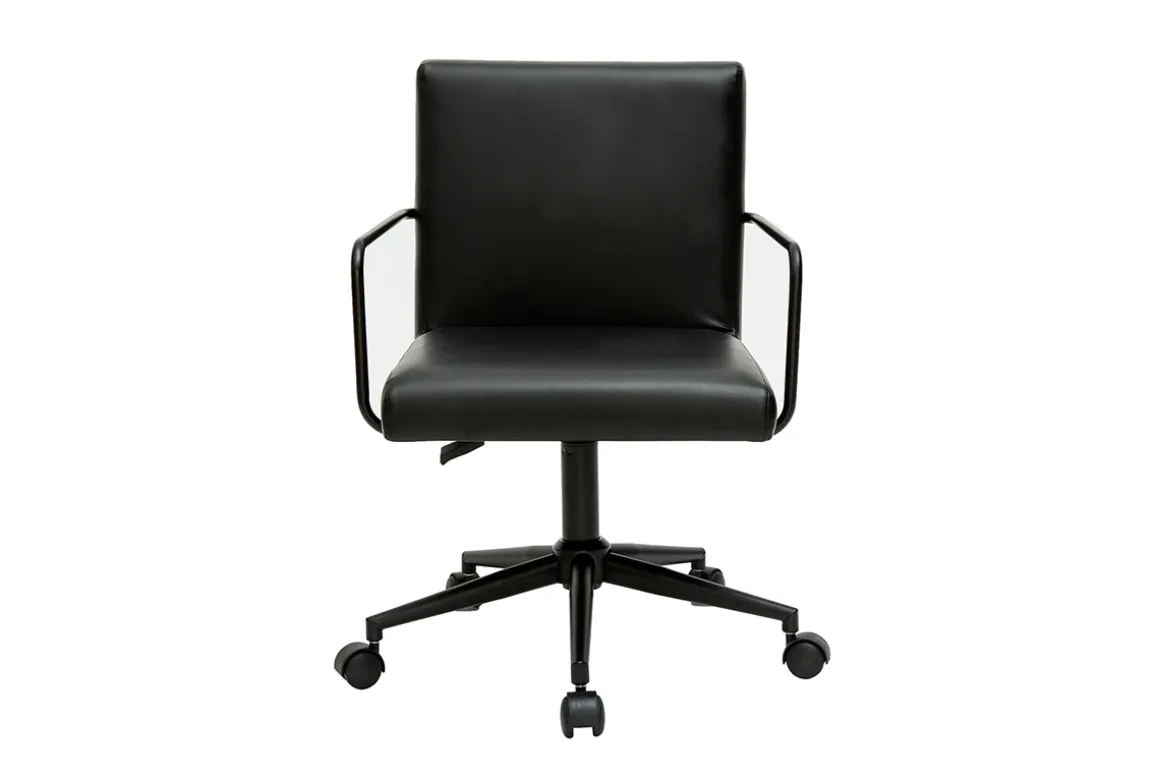 Parfaite pour créer un lieu propice à la productivité sans négliger le style, cette chaise de bureau revisite les codes classiques du fauteuil de bureau. Le détail des fins accoudoirs tubulaires et le piètement 5 branches en métal noir apportent une touche de légèreté et modernisent avec subtilité le siège aux volumes cossus et à l’inspiration vintage. L’assise est sublimée par un revêtement en polyuréthane noir au caractère authentique et chaleureux. Un look monochrome et des lignes sobres qui s’inscrivent avec brio dans la grande tendance de la déco industrielle.