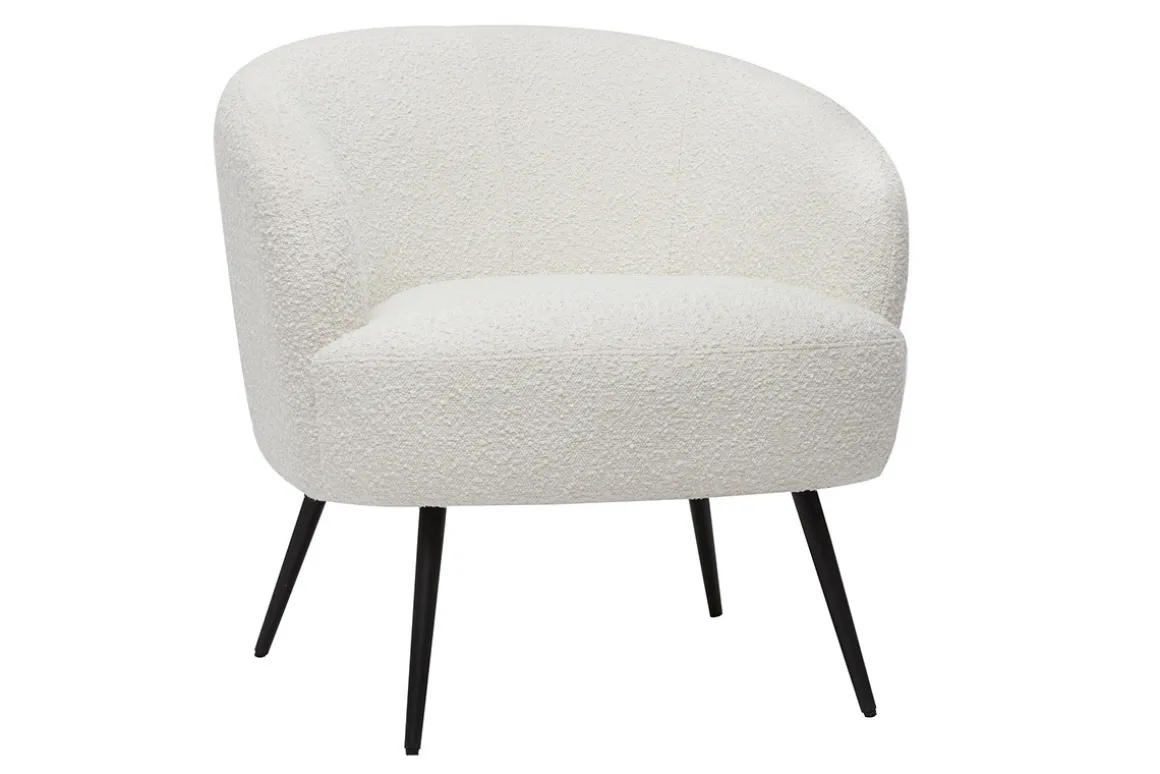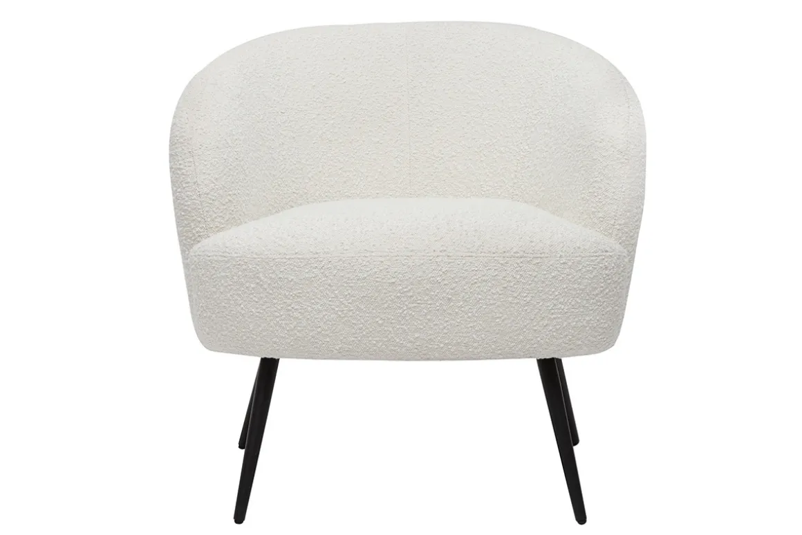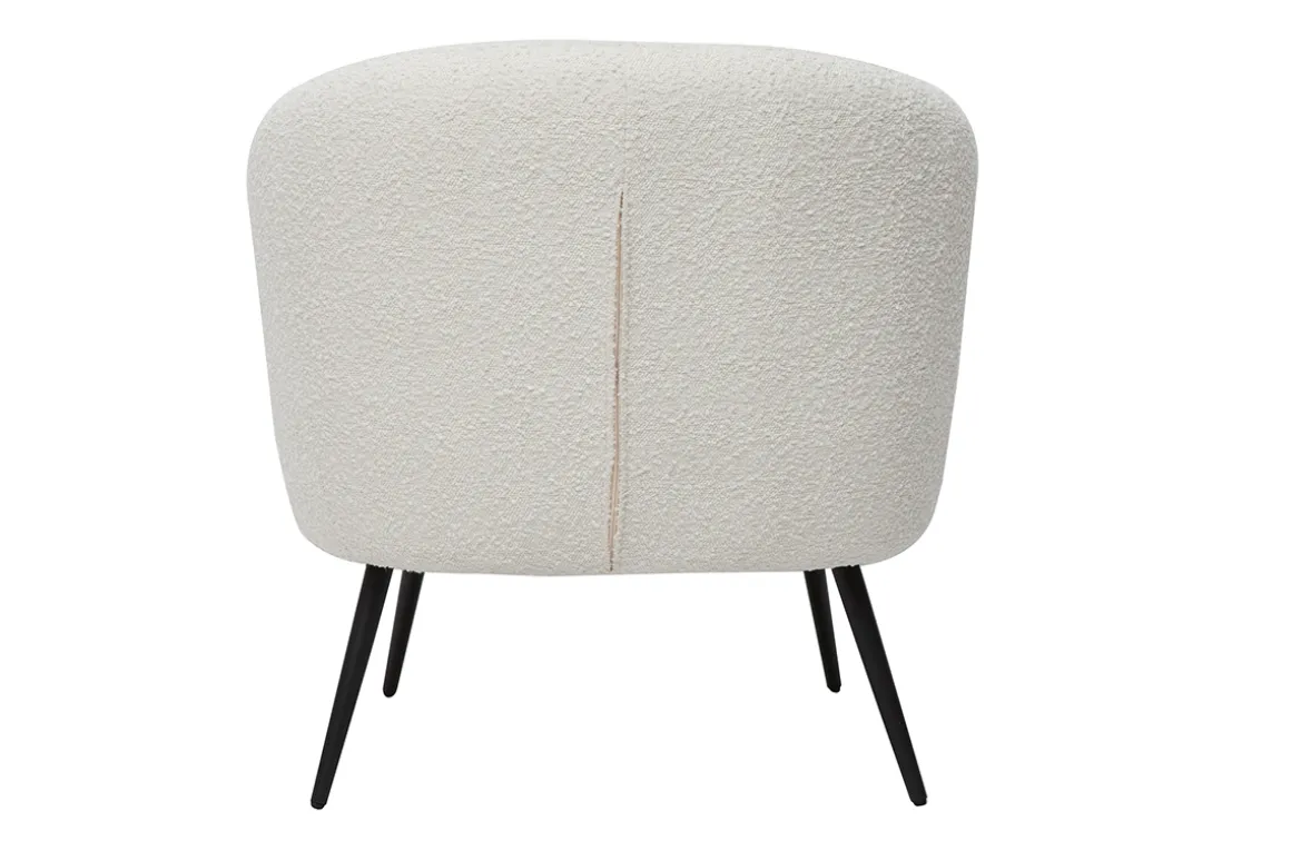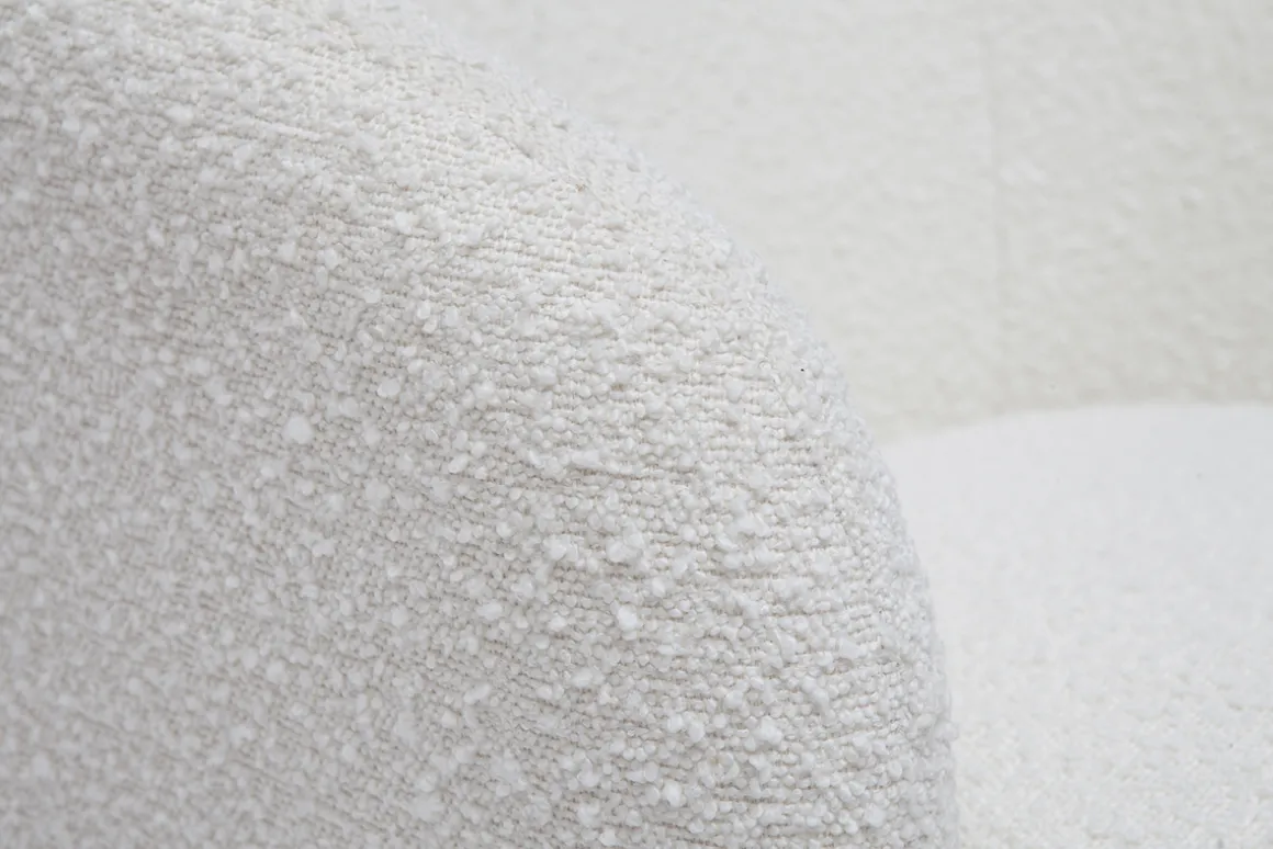 Ce fauteuil design blanc cassé est recouvert d’un superbe tissu effet laine bouclée (100% polyester) à la texture duveteuse et réconfortante. Sa généreuse assise (épaisseur 21 cm) combine des ressorts et 2 épaisseurs de mousse pour toujours plus de confort (densités 25 kg/m3 et 24 kg/m3).