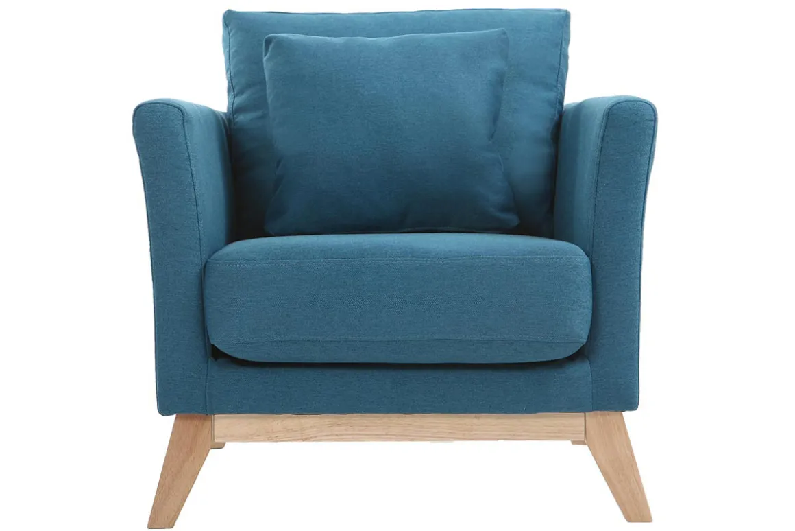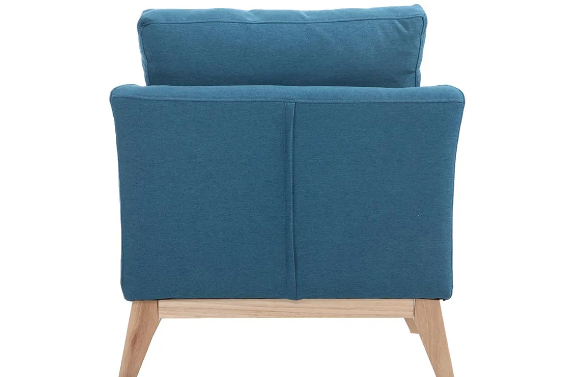 Fauteuil scandinave déhoussable en tissu bleu canard et bois clair OSLO, livré prêt à assembler. Montage simple, seul le piètement est à fixer.