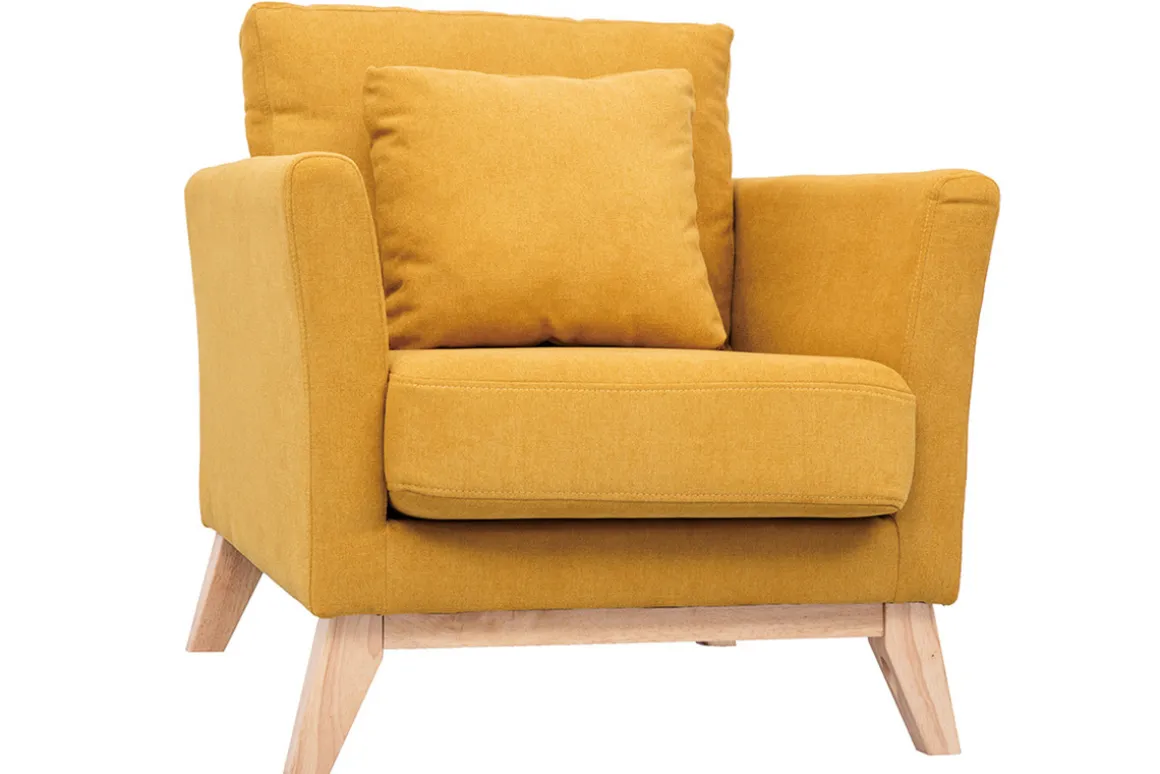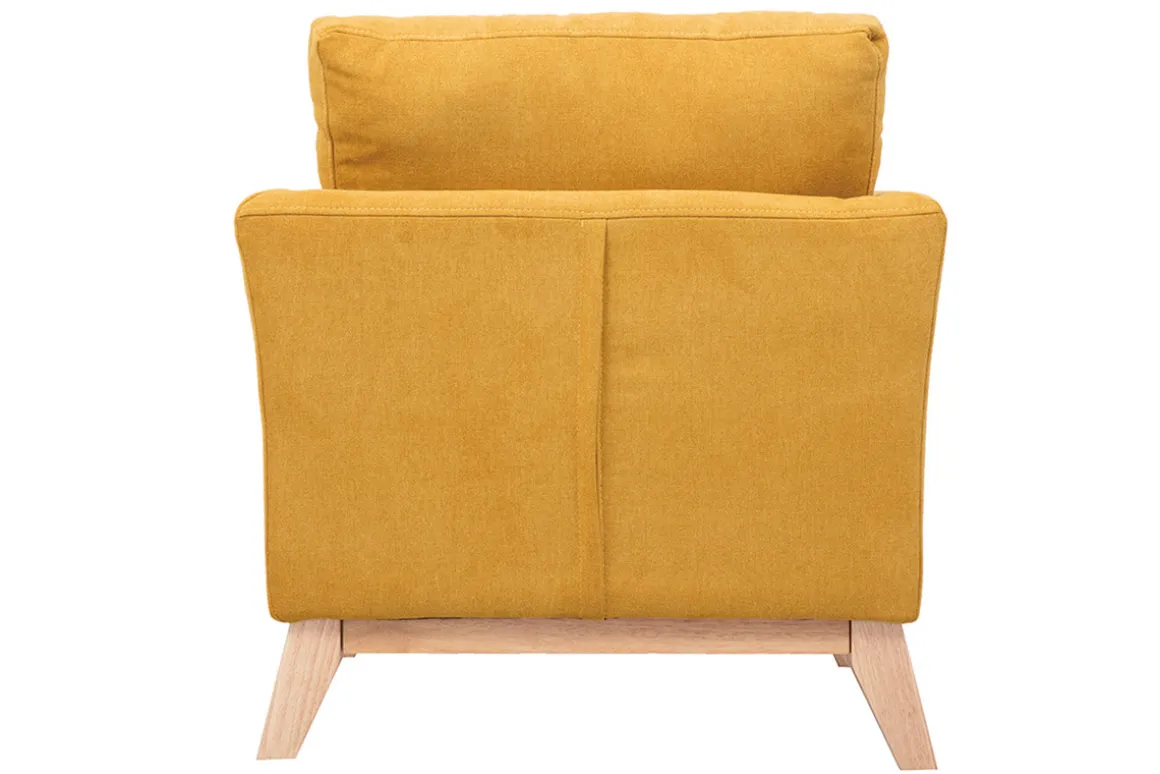 Fauteuil scandinave déhoussable en tissu effet velours jaune moutarde et bois clair OSLO, livré prêt à assembler. Montage simple, seul le piètement est à fixer.