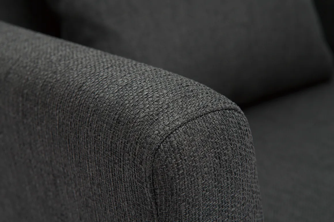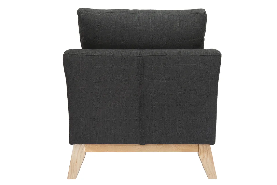 Fauteuil scandinave déhoussable en tissu gris foncé et bois clair OSLO, livré prêt à assembler. Montage simple, seul le piètement est à fixer.
