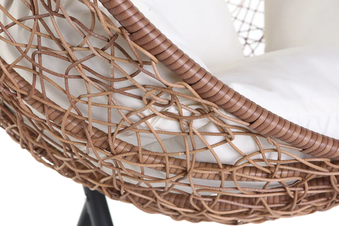 Accordez-vous une pause détente hors du temps. Ce fauteuil suspendu oeuf sur pied a été imaginé comme un véritable cocon de confort où il fait bon se relaxer. Son design est inspiré par la nature. Les fils synthétiques en résine façon rotin naturel et leurs lignes sinueuses rappellent les branchages des nids d’oiseau. Légers et aériens, ils dessinent une coque en forme d’oeuf qui fait toute la beauté de ce modèle de fauteuil suspendu à l’inspiration bohème. L’ensemble est maintenu par un solide pied en métal pouvant supporter jusqu’à 120 kg.