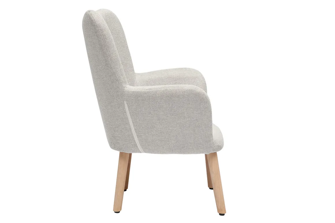 Fauteuil scandinave en tissu effet velours texturé beige livré prêt à monter. Seuls les pieds sont à fixer.