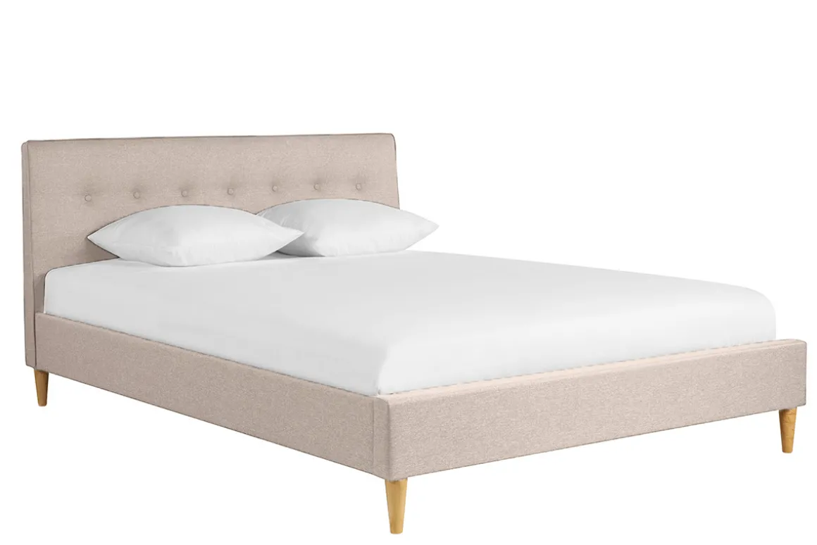Lit 2 places 160×200 cm avec tête de lit en tissu beige LEONCE livré prêt à assembler.