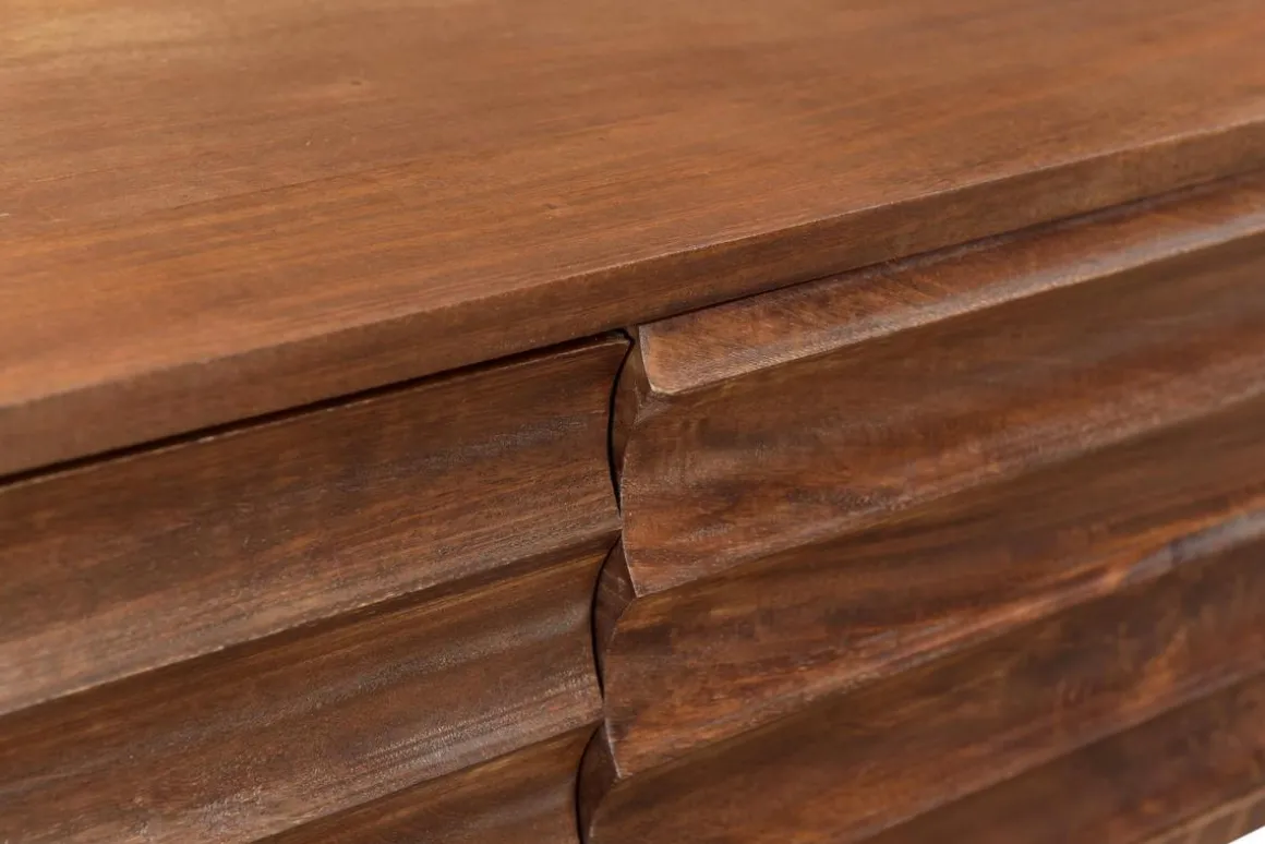 Fruit d’un savoir-faire unique, ce meuble TV artisanal réalisé en manguier massif se distingue par ses façades sculptées directement dans la matière. Le motif basé sur une succession de lignes horizontales offre un rendu ultra contemporain. Le manguier massif enduit d’une patine marron foncé – qui nourrit et protège la matière – a été travaillé artisanalement pour offrir ce relief singulier qui souligne particulièrement bien l’aspect authentique et le caractère unique de cette essence de bois exotique.