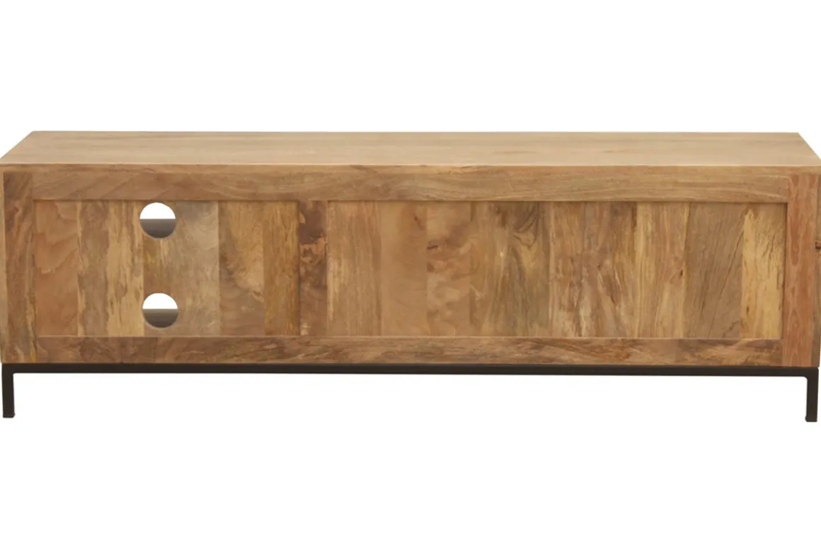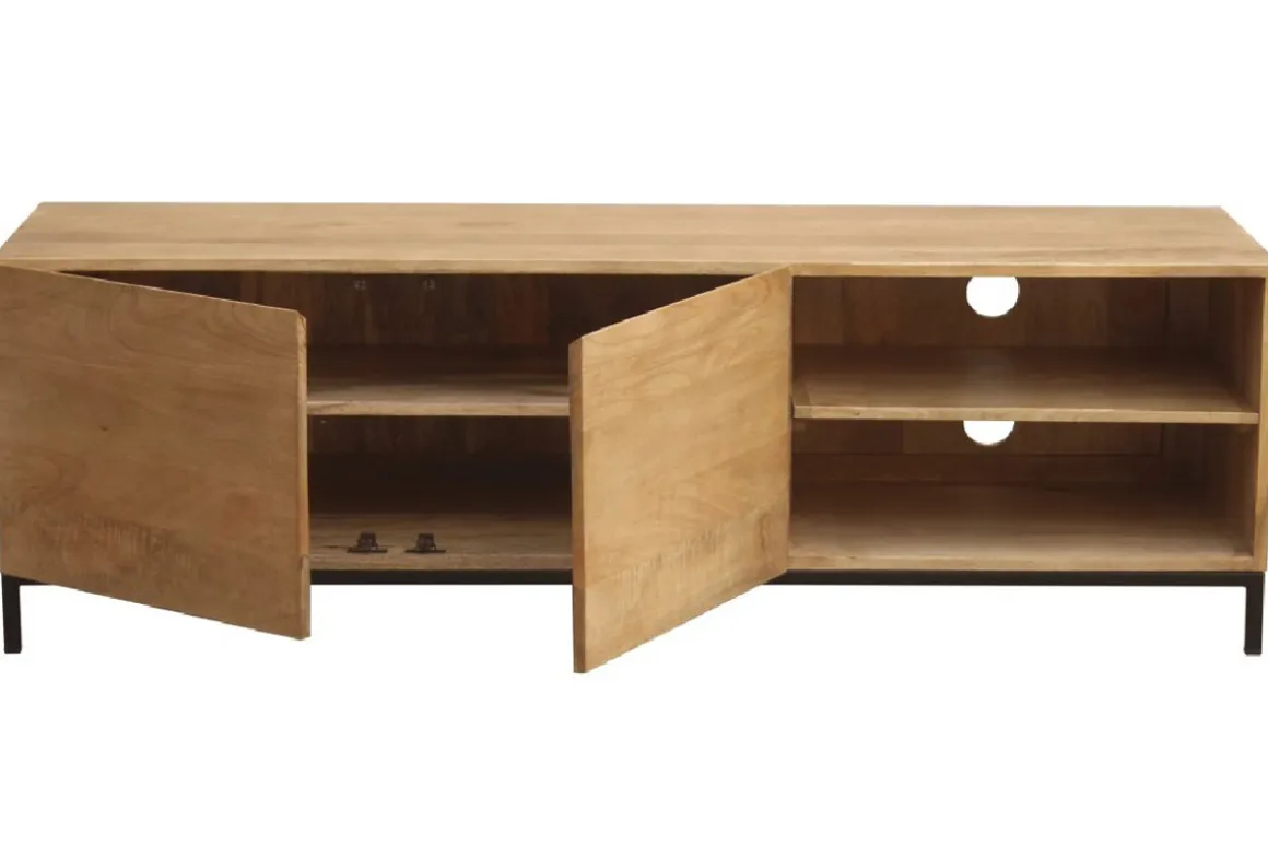 Unique, ce meuble TV apporte de la puissance à votre intérieur. Conçu entièrement en manguier, il possède une finition exemplaire avec sa couche de vernis. Robuste, il possède un piétement en métal qui supportera votre télévision ainsi que tous les appareils HiFi. Avec ses niches fermées et ses niches ouvertes, ce meuble TV dispose de nombreux rangements qui vous satisferont. Ses dimensions généreuses vous offrent la possibilité d’exposer vos objets déco en plus de votre téléviseur.