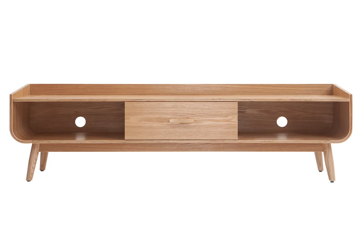 Les lignes arrondies et épurées de ce meuble TV sont très agréables, elles apportent de la douceur à votre intérieur ainsi qu’un look naturel tendance. Le meuble TV HALLEN se compose d’un long plateau de 180 cm ainsi que de deux niches et un tiroir central. Pour plus d’esthétisme, deux trous à l’arrière du meuble ont été réalisés pour laisser passer les câbles de vos appareils électroniques. Ce long meuble TV L180 cm est composé de panneaux de fibres de bois placage frêne et de frêne massif pour le piètement.
