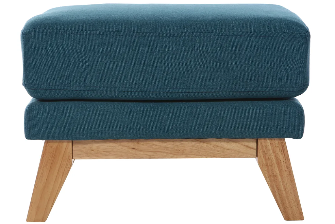 Pouf repose-pieds déhoussable scandinave en tissu bleu canard et bois clair OSLO livré à assembler. Montage simple, seuls les pieds sont à fixer.