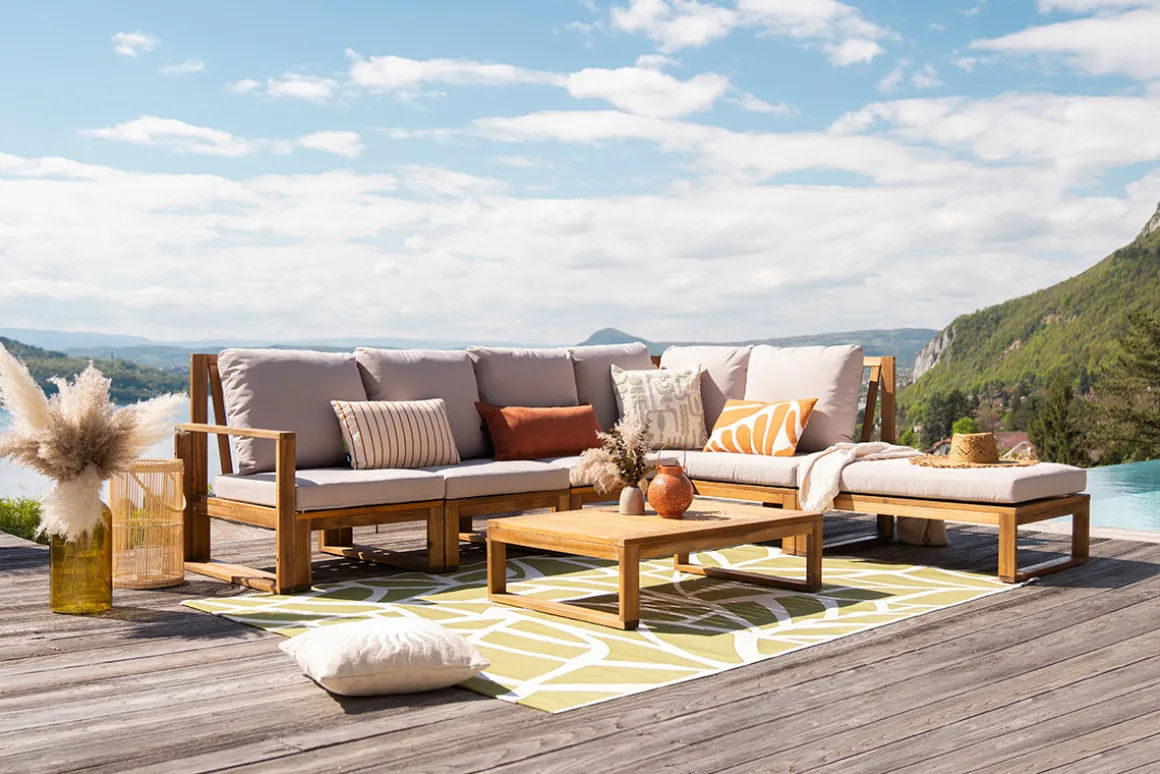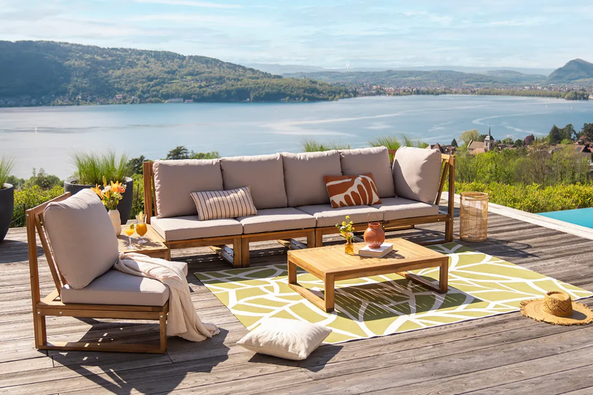 Une belle couleur, de jolies nuances de bois, le bon mobilier : il ne faut pas grand-chose pour profiter pleinement de son extérieur. Essentiel pour aménager un coin détente dans son jardin, habillez votre sol d’un grand tapis d’extérieur. Une signature cosy qui fera toute la différence !