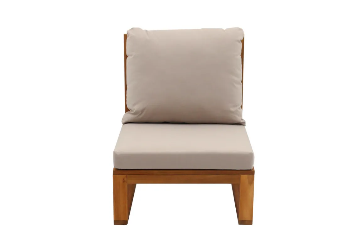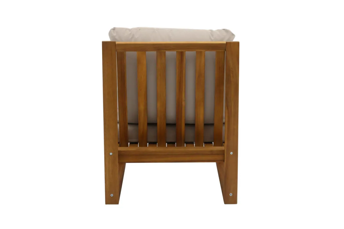 Si bois et taupe forment une association inspirée de la déco méditerranéenne dont on ne fait plus l’éloge, le choix d’une structure en acacia massif et d’un revêtement en tissu déperlant (100% polyester) résistant aux UV, permet d’allier style, fonctionnalité, bonne résistance aux intempéries et confort. Un ensemble qui gagne en volume grâce aux coussins d’assises et de dossiers déhoussables garnis d’une mousse densité 20 kg/m³.