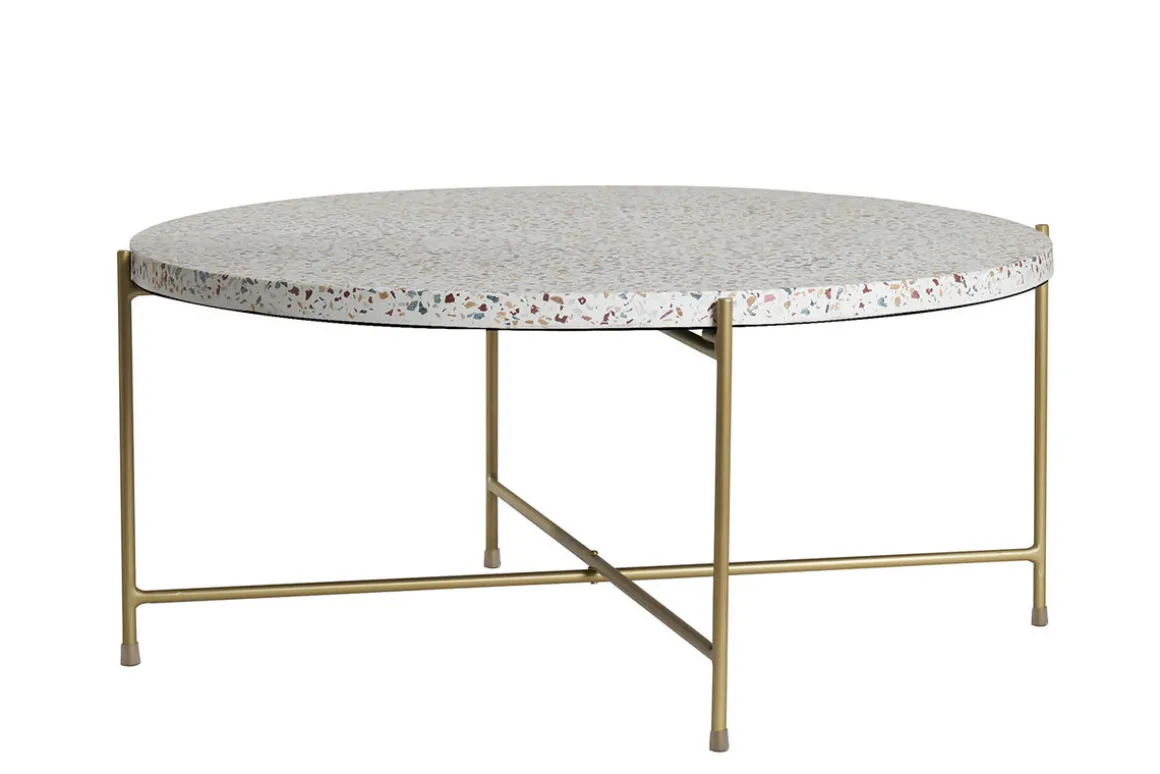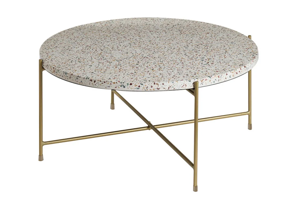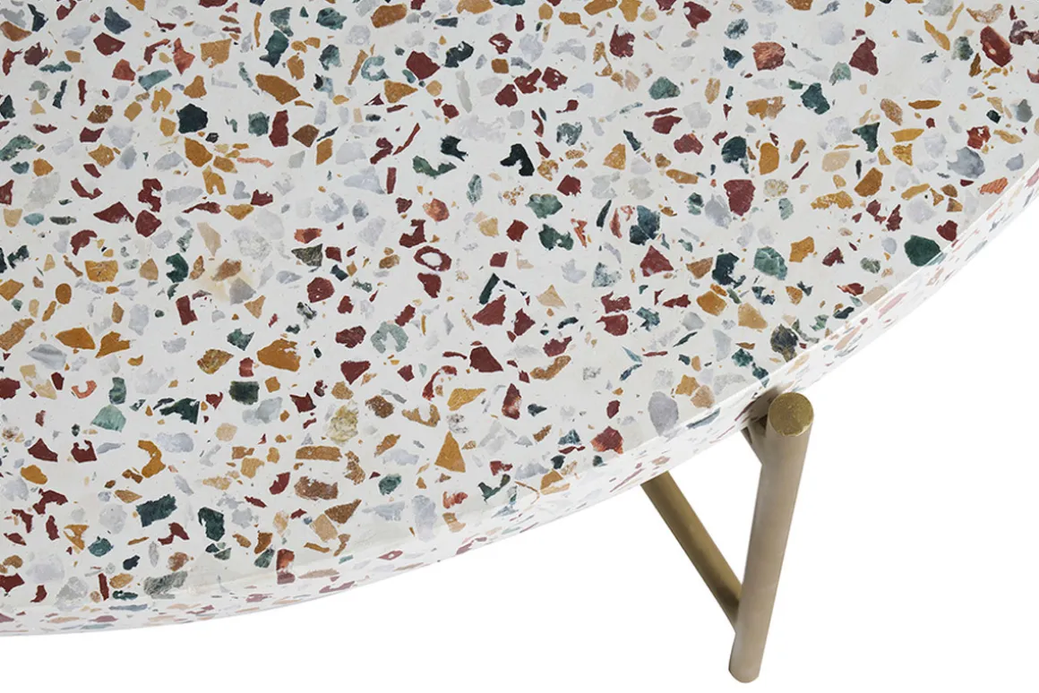 Le plateau à la composition hypnotique – mélange de fragments de pierres naturelles colorées liées par un ciment poli – gagne en superbe grâce au piètement filaire et aérien en métal doré qui le soutient. Cette table basse ronde en terrazzo et métal doré offre un mix and match éloquent de couleurs et matières. Coup de foudre dès le premier regard !