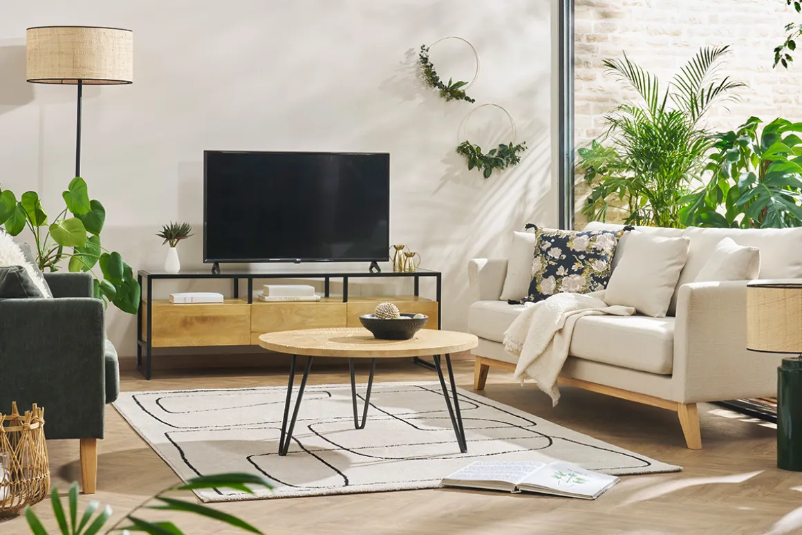 Accompagnée d’un canapé design et d’un beau tapis graphique, cette table basse en bois massif donnera au salon un esprit nature.