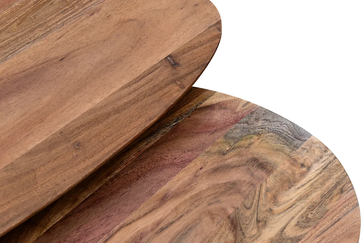 Conçues en acacia massif, une essence de bois robuste aux sublimes tons rougeoyants, elles apportent une note chaleureuse au décor. Leurs plateaux en bois reposent sur des pieds en métal noir : ce superbe contraste donne beaucoup de caractère à l’ensemble !