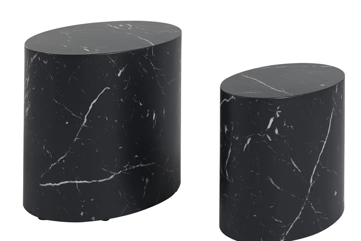 Besoin de ranger occasionnellement vos tables ? Dans l’esprit gigogne, ce lot de 2 tables basses ovales en panneaux de fibres de bois finition marbré noir se combinent en un clin d’oeil. Dissimulée par la grande table (L33 x P48 x H40 cm), la petite table (L24.5 x P40 x H33 cm) s’efface au profit d’un seul bloc graphique. Discrétion et faible encombrement garantis !