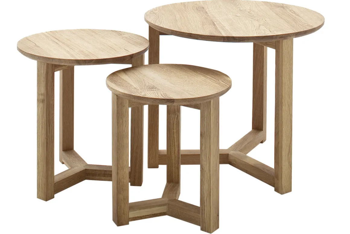 Entièrement composées de chêne dont l’essence est protégée par une finition huilée, ces 3 tables basses sont idéales pour réchauffer la décoration du salon. Elles se marieront aussi bien à un intérieur scandinave, accompagnées d’un doux rocking chair qu’à un salon ethnique ou bohème, complétées par un fauteuil en teck ! Grâce à leur plateau tout en rondeur, ces tables gigognes sont idéales pour se créer une atmosphère cocooning et zen dans son séjour.