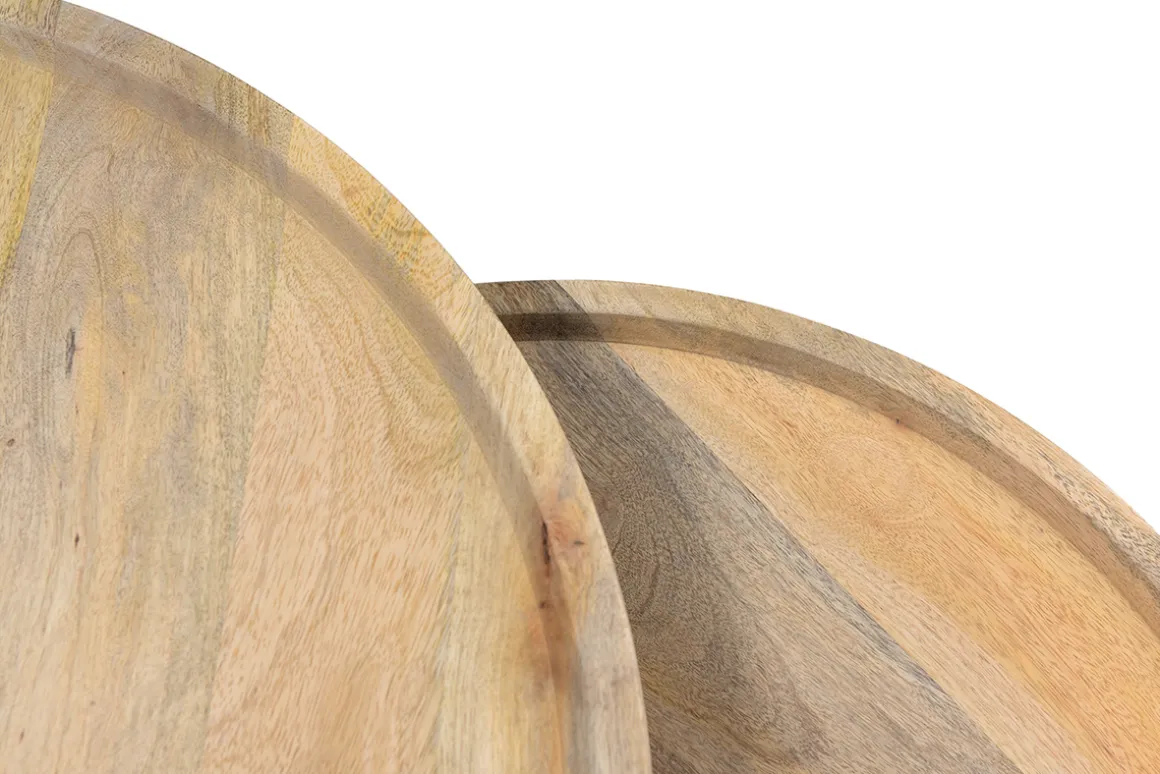 Les tables basses gigognes LEDGE sont fabriquées de manière artisanale. Elles offrent un rendu unique et de belles finitions, notamment différentes nuances de bois sur les plateaux. Ces derniers sont en manguier, une essence de bois tropicale et chaleureuse qui dispose de stries singulières. Pour plus de robustesse et de solidité, la structure est en métal noir.