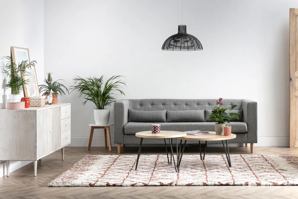 Pour un salon dans un style industriel subtil et élégant, on accompagne ce lot de 2 tables basses en bois et métal d’un beau tapis tendance.