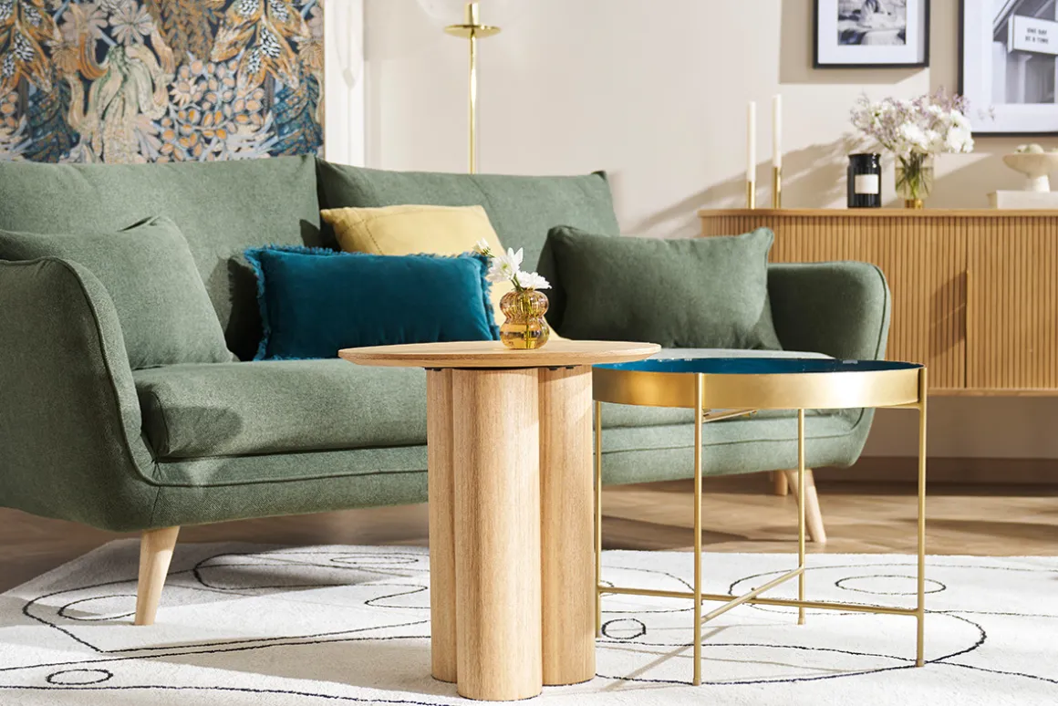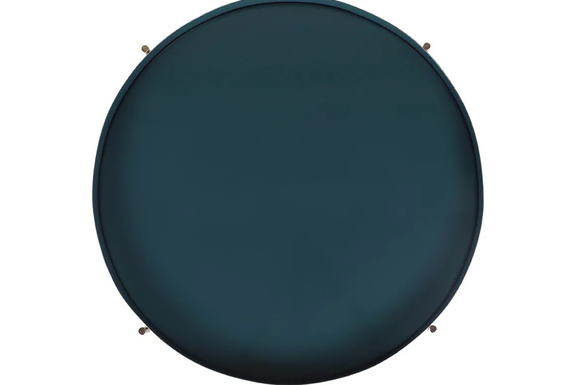 Cette table ronde qui pourra servir autant de table basse que de table d’appoint est équipée d’un plateau laqué brillant couleur bleu canard/blanc et d’une structure en laiton doré. Que l’on opte pour l’esprit raffiné des couleurs sombres ou l’élégance intemporelle du mariage blanc et or, on profite toujours d’une belle surface (51 cm de diamètre) pour accueillir les affaires du salon.
