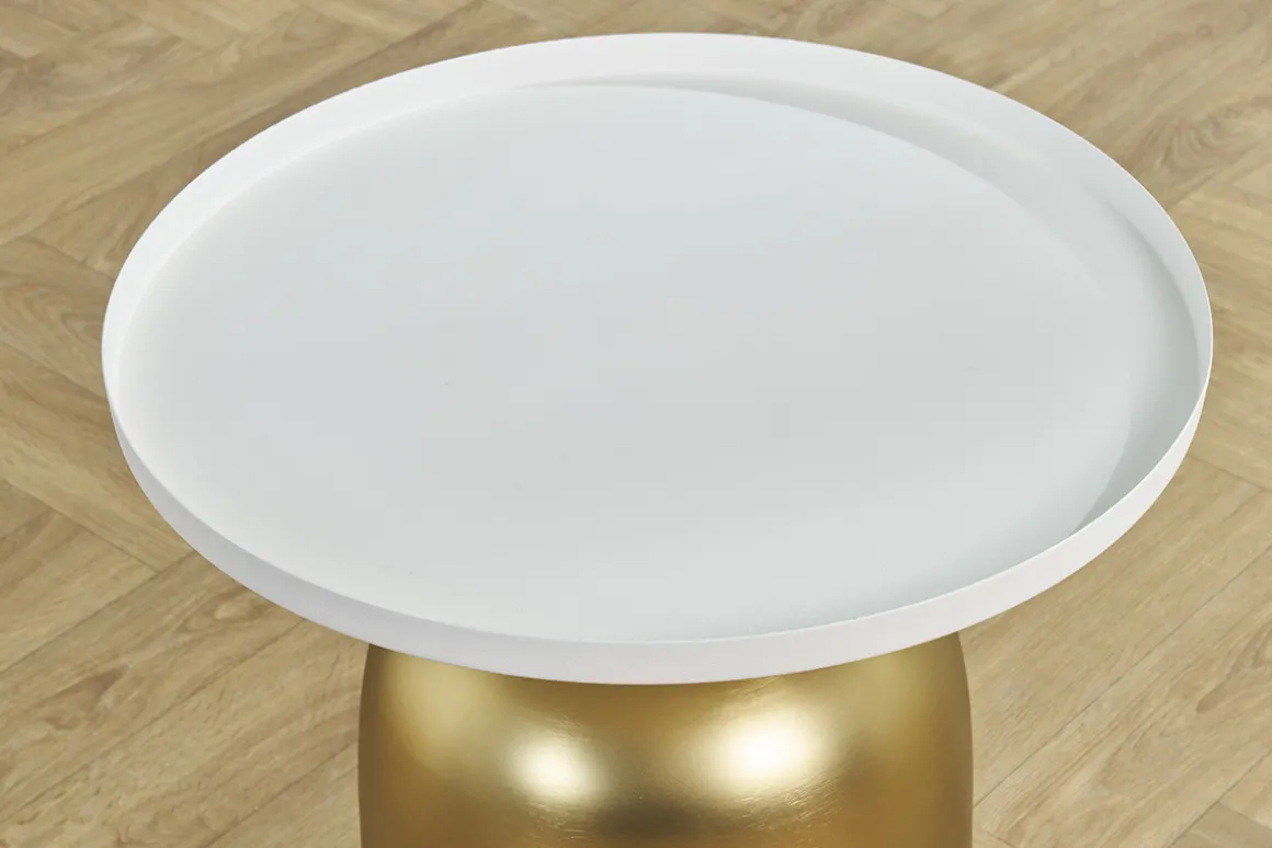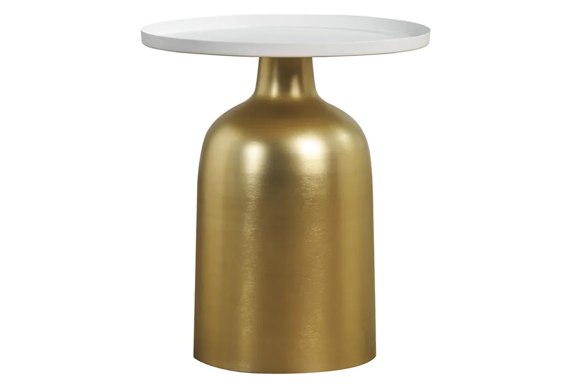 Cette table 100% métal est issue d’un joli travail sur la matière. On aime ses lignes rondes, simples et massives et ses volumes parfaitement équilibrés. Le pied cylindrique en métal doré contraste brillamment avec le plateau de couleur blanc mat.
