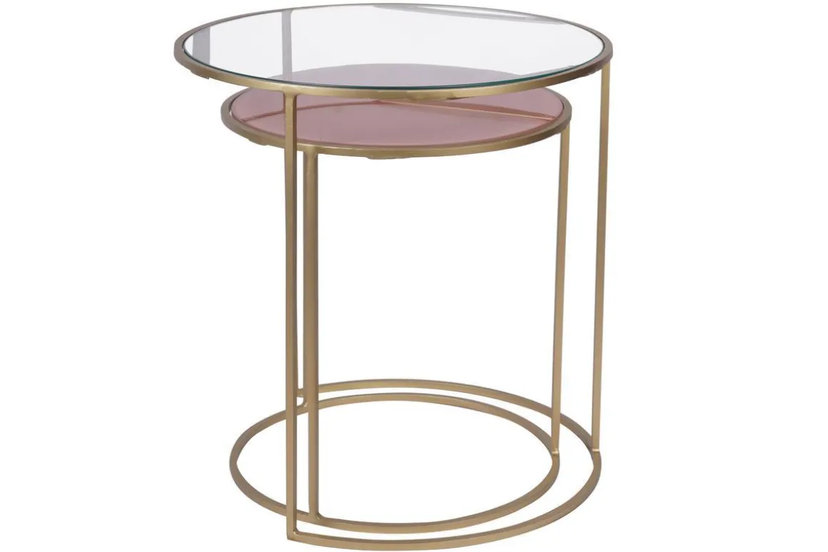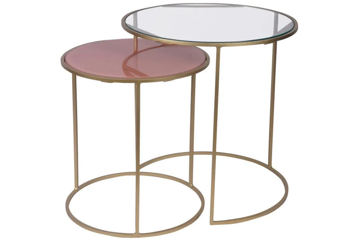 Fabriquées à partir de métal doré, les structures aériennes dessinent des lignes graphiques dans l’espace. Elles s’équilibrent parfaitement avec les plateaux en verre fins et délicats. Le plateau de la grande table basse est en verre transparent tandis que le plateau de la petite présente une jolie teinte rose tendre.