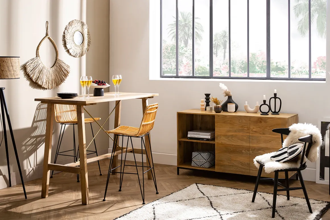 Cette table de bar en manguier massif vous accompagne dans tous vos moments de convivialité, du petit-déjeuner quotidien en famille aux apéritifs entre amis. Essence exotique aux tons et nervures uniques, le manguier possède un aspect brut et un charme authentique. Son plateau (L130 x P70 cm) permet de réunir facilement 4 personnes et pourra également faire office de plan de travail supplémentaire dans une cuisine ouverte sur le séjour.