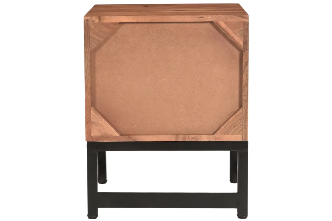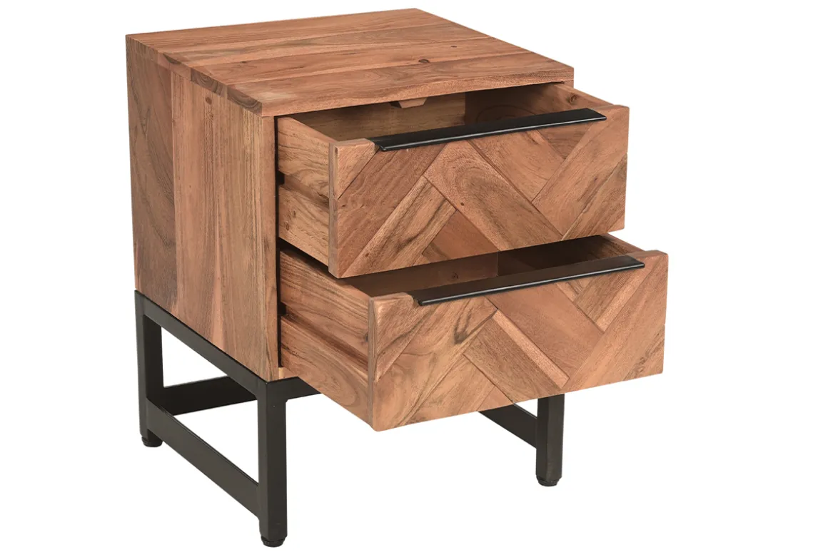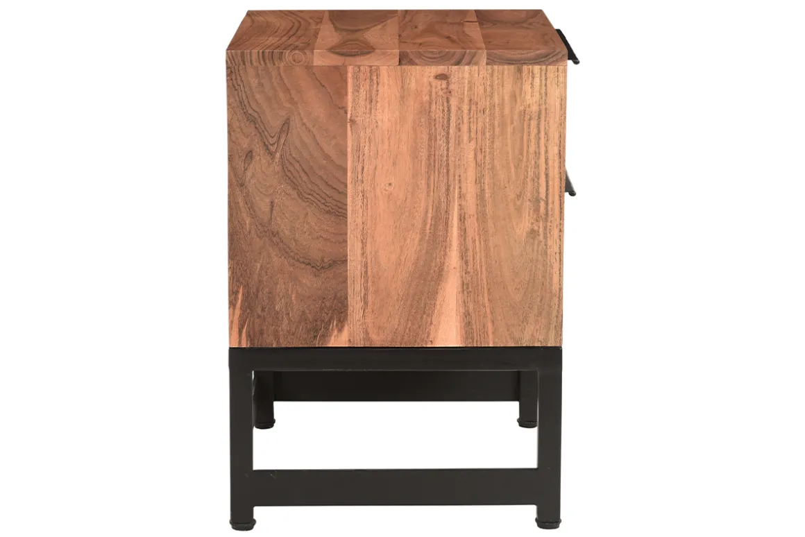 On affectionne tout particulièrement l’association du bois à un piétement et des poignées en métal noir. Ce beau contraste ajoute un supplément de caractère à cette table de chevet tendance.