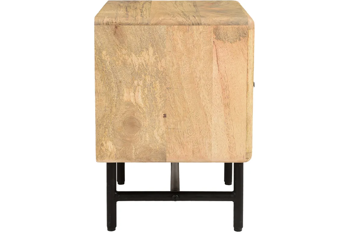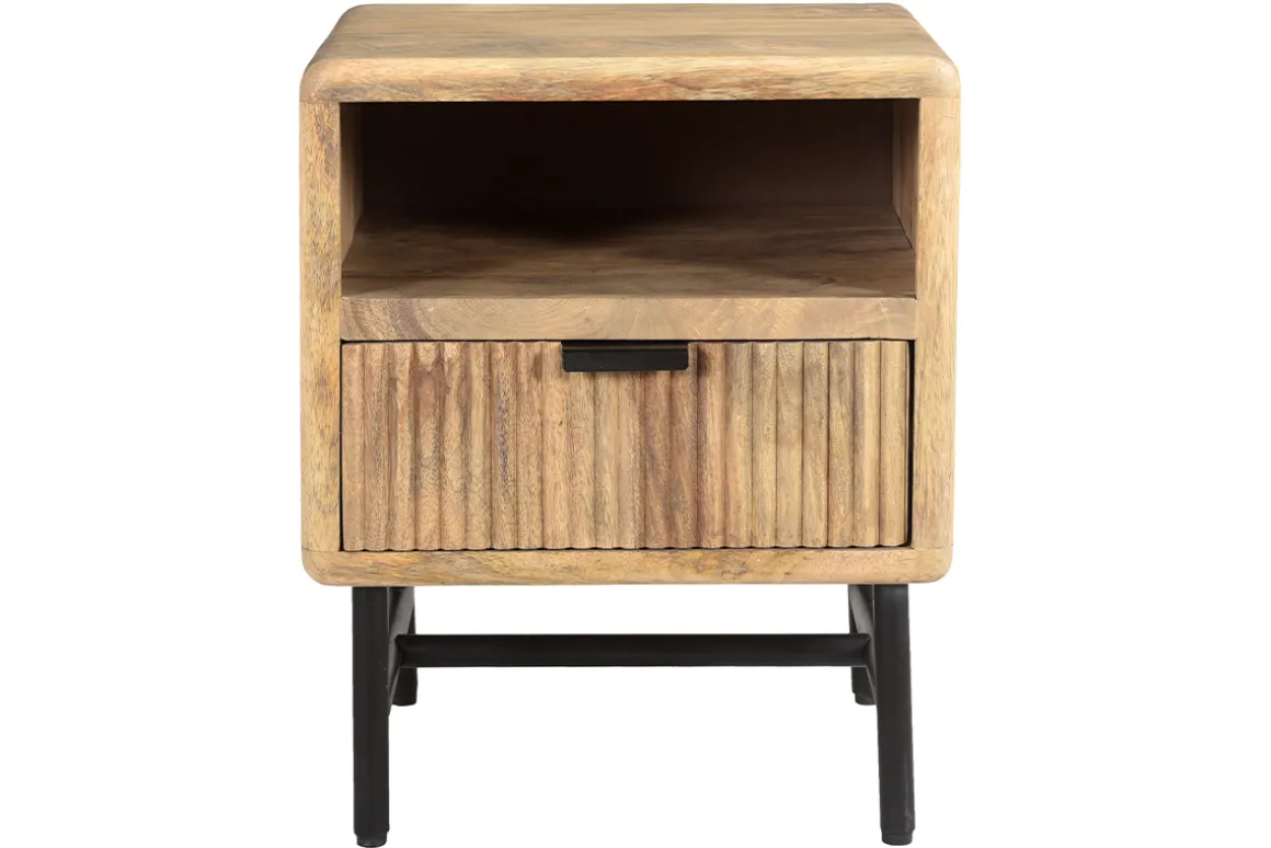 Subtilement, le piètement tubulaire en métal noir apporte une touche de modernité et de légèreté au caisson en manguier massif. Lumineuse, cette essence de bois exotique fait partie de ces matériaux durables dont on ne vante plus les mérites en termes de robustesse et d’esthétisme. Les gravures verticales signent avec originalité la façade du tiroir et donnent du rythme à l’ensemble. À la fois graphique et authentique, on imagine cette table de chevet en bois massif (fond du meuble en panneaux de fibres de bois) réchauffer un intérieur aux accents ethnique chic. Dans une ambiance tropicale sur fond d’imprimés feuilles de palme et oiseaux du paradis, elle sera du plus bel effet !
