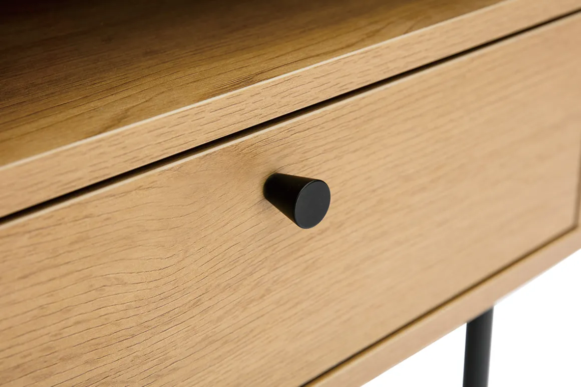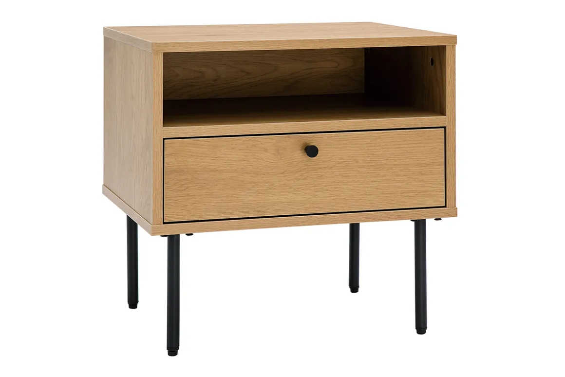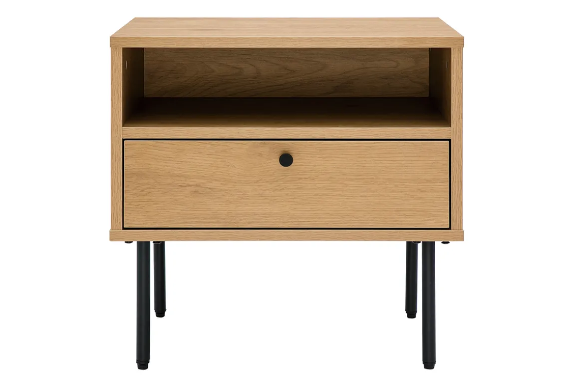 Avec ses dimensions parfaites (L50 x P42 x H50 cm), la table de chevet PERNELLE investit les petits espaces comme les plus grands. Ses lignes sobres et intemporelles et son piètement ultra fin en métal noir (H20 cm) permettent de ne pas surcharger visuellement l’espace. Le caisson en panneaux de particules finition chêne (mélamine) arbore de jolies nuances dorées ainsi que des veines marquées. On aime cette association entre le caractère authentique du bois et le langage contemporain du métal.
