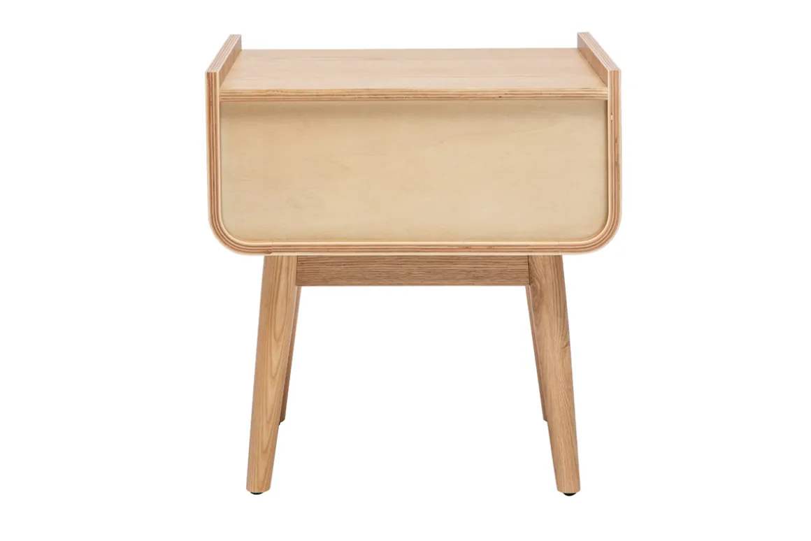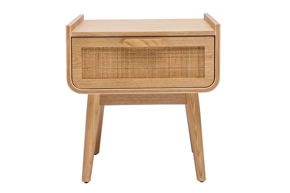 Composée d’une structure en placage frêne, la façade du tiroir avec poignée – pour une bonne prise en main – s’habille de cannage de rotin, l’ensemble est soutenu par un solide piètement en bois massif.